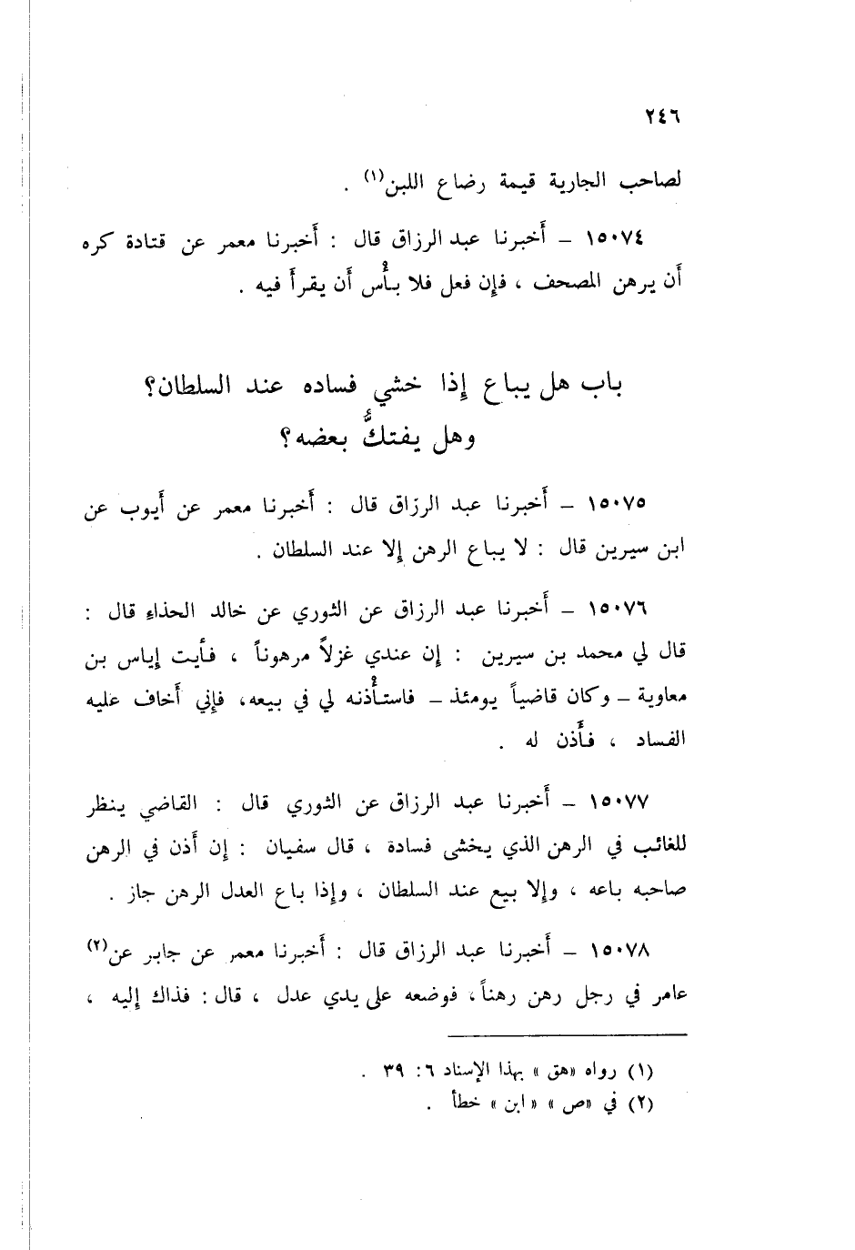 15075 - عَبْدُ الرَّزَّاقِ قَالَ: أَخْبَرَنَا مَعْمَرٌ، عَنْ أَيُّوبَ، عَنِ ابْنِ سِيرِينَ قَالَ: «§لَا يُبَاعُ الرَّهْنُ إِلَّا عِنْدَ السُّلْطَانِ»