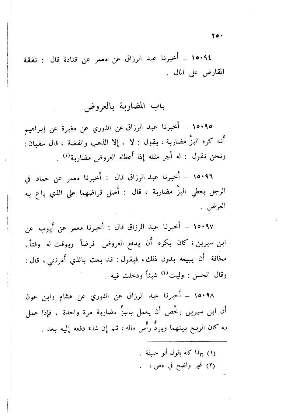 15098 - أَخْبَرَنَا عَبْدُ الرَّزَّاقِ، عَنِ الثَّوْرِيِّ، عَنْ هِشَامٍ، وَابْنِ عَوْنٍ، «أَنَّ ابْنَ سِيرِينَ §رَخَّصَ أَنْ يَعْمَلَ بِالْبَزِّ مُضَارَبَةً مَرَّةً وَاحِدَةً، فَإِذَا عَمِلَ بِهِ، كَانَ الرِّبْحُ بَيْنَهُمَا، وَيَرُدُّ رَأْسَ مَالِهِ، ثُمَّ إِنْ شَاءَ دَفَعَهُ إِلَيْهِ بَعْدُ»