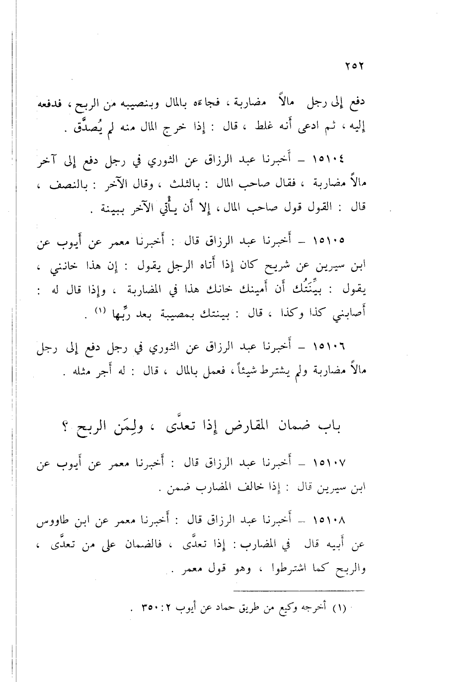 15108 - عَبْدُ الرَّزَّاقِ قَالَ: أَخْبَرَنَا مَعْمَرٌ، عَنِ ابْنِ طَاوُسٍ، عَنْ أَبِيهِ قَالَ فِي §الْمُضَارِبِ: «إِذَا تَعَدَّى فَالضَّمَانُ عَلَى مَنْ تَعَدَّى، وَالرِّبْحُ كَمَا اشْتَرَطُوا» وَهُوَ قَوْلُ مَعْمَرٍ