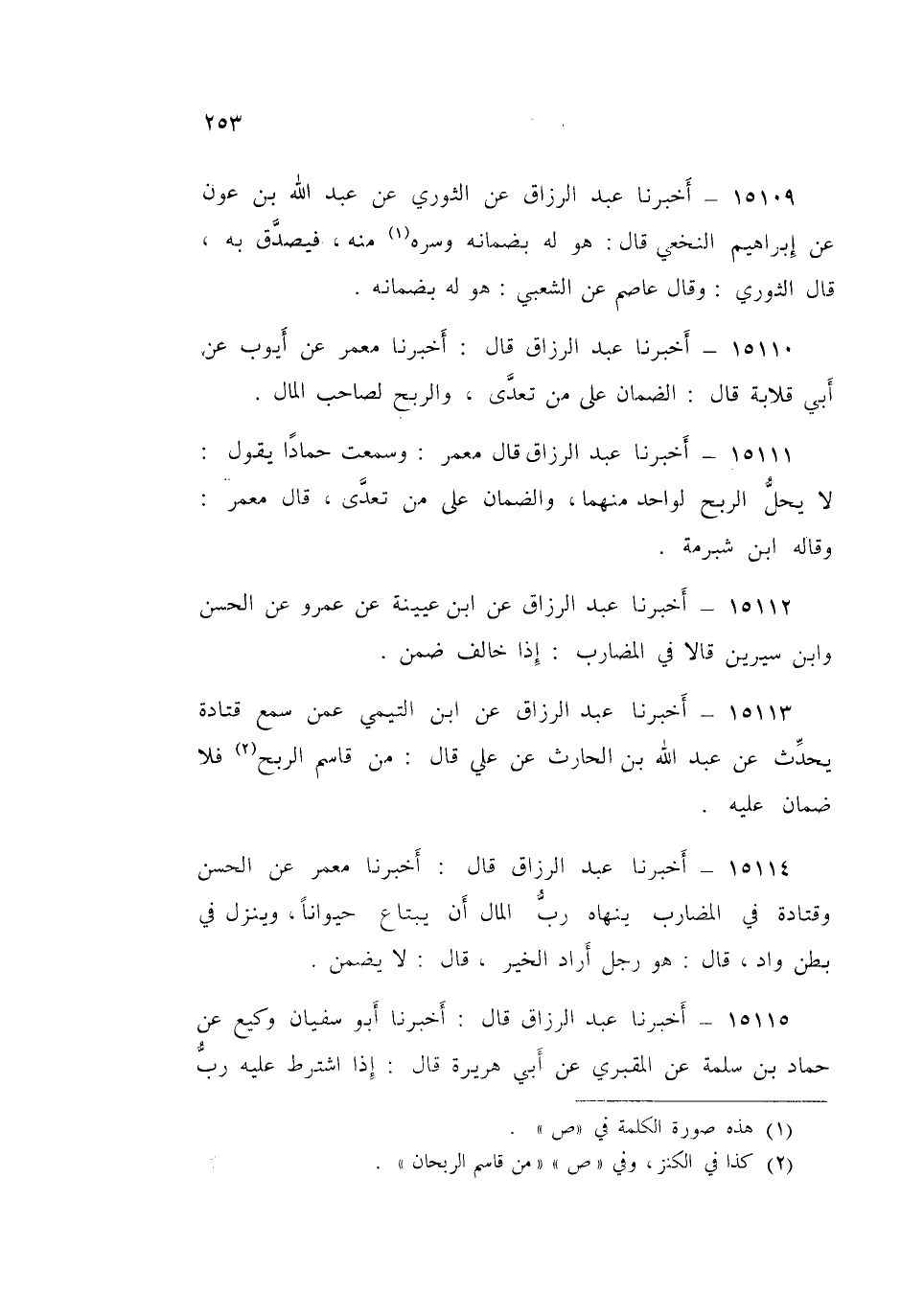15111 - عَبْدُ الرَّزَّاقِ قَالَ مَعْمَرٌ: وَسَمِعْتُ حَمَّادًا يَقُولُ: «§لَا يَحِلُّ الرِّبْحُ لِوَاحِدٍ مِنْهُمَا، وَالضَّمَانُ عَلَى مَنْ تَعَدَّى» قَالَ مَعْمَرٌ: وَقَالَهُ ابْنُ شُبْرُمَةَ
