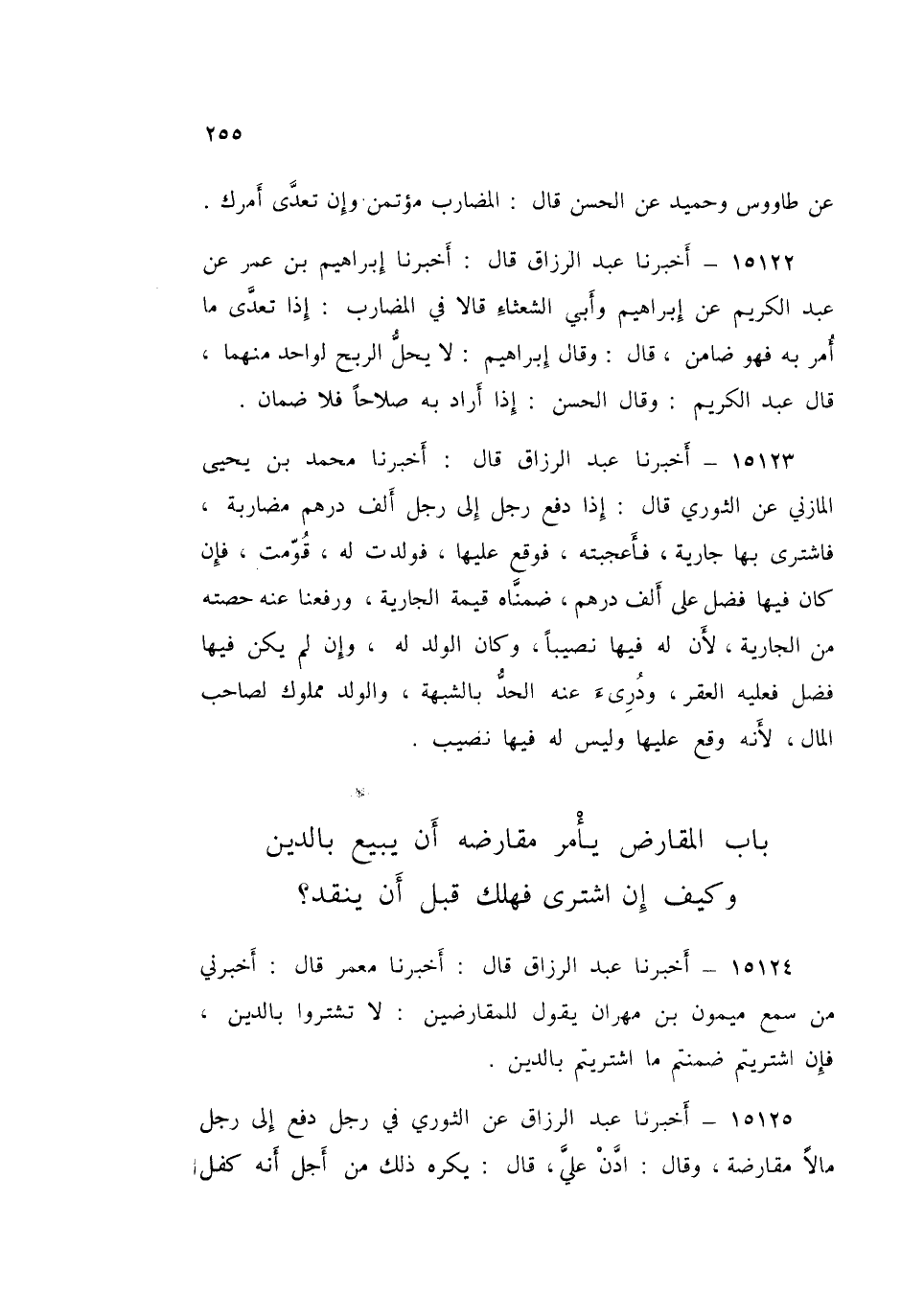 15124 - عَبْدُ الرَّزَّاقِ قَالَ: أَخْبَرَنَا مَعْمَرٌ قَالَ: أَخْبَرَنِي مَنْ سَمِعَ مَيْمُونَ بْنَ مِهْرَانَ، يَقُولُ §لِلْمُقَارَضِينَ: «لَا تَشْتَرُوا بِالدَّيْنِ، فَإِنِ اشْتَرَيْتُمْ ضَمِنْتُمْ مَا اشْتَرَيْتُمْ بِالدَّيْنِ»