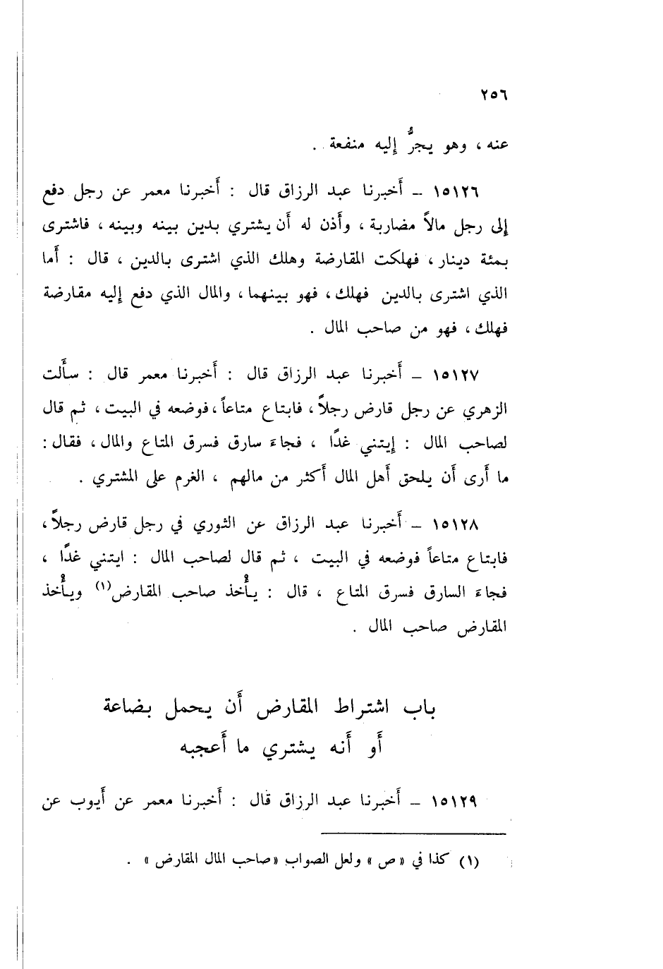 15128 - أَخْبَرَنَا عَبْدُ الرَّزَّاقِ قَالَ: عَنِ الثَّوْرِيِّ فِي §رَجُلٍ قَارَضَ رَجُلًا فَابْتَاعَ مَتَاعًا فَوَضَعَهُ فِي الْبَيْتِ، ثُمَّ قَالَ لِصَاحِبِ الْمَالِ: ائْتِنِي غَدًا، فَجَاءَ السَّارِقُ فَسَرَقَ الْمَتَاعَ قَالَ: «يَأْخُذُ صَاحِبُ الْمَالِ الْمُقَارَضَ، وَيَأْخُذُ الْمُقَارَضَ صَاحِبُ الْمَالِ»