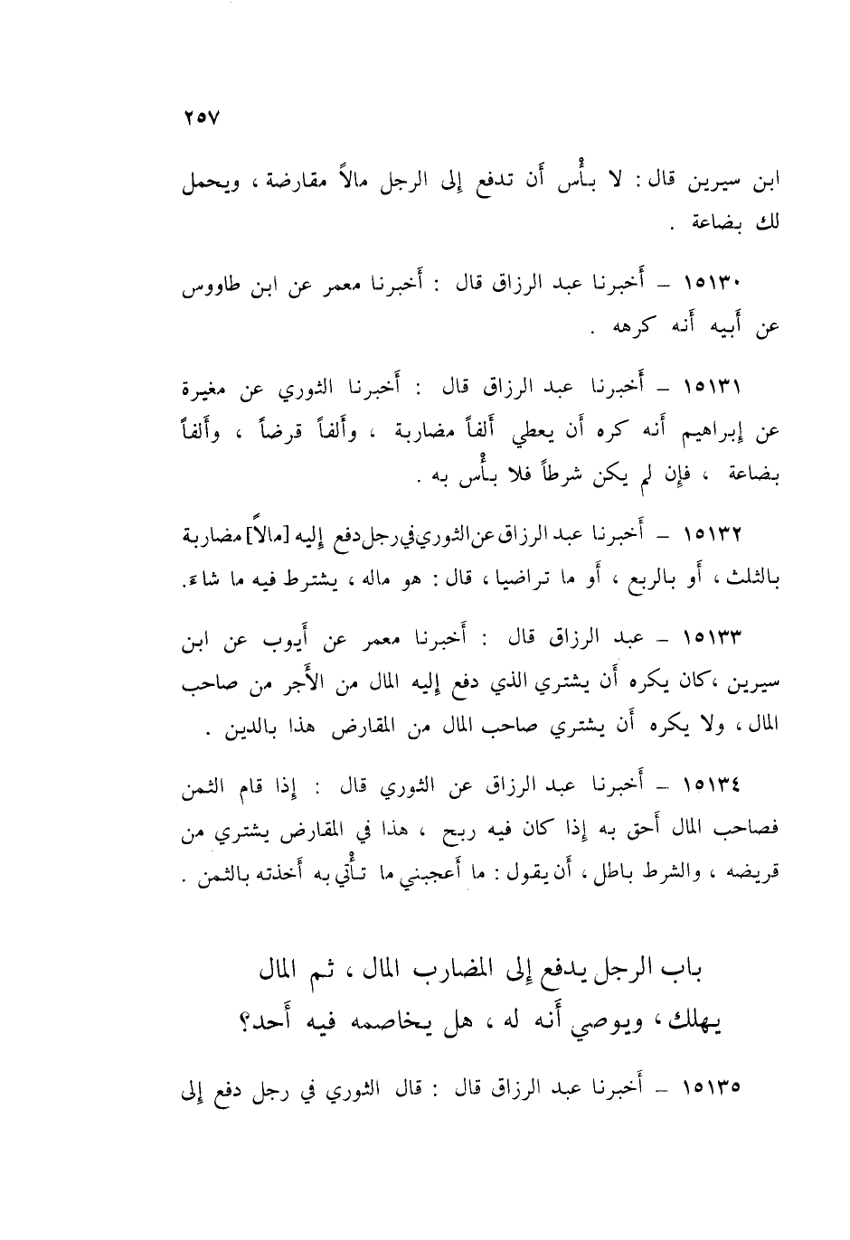 15136 - عَبْدُ الرَّزَّاقِ قَالَ: أَخْبَرَنَا إِسْمَاعِيلُ بْنُ عَبْدِ اللَّهِ قَالَ: أَخْبَرَنِي زَكَرِيَّا بْنُ أَبِي زَائِدَةَ قَالَ: اخْتُصِمَ إِلَى الشَّعْبِيِّ فِي §رَجُلٍ دَفَعَ إِلَى رَجُلٍ أَرْبَعَةَ آلَافِ دِرْهَمٍ مُضَارَبَةً، فَخَرَجَ بِهَا الَّذِي دُفِعَتْ إِلَيْهِ وَأَشْهَدَ عَلَيْهِ رَبَّ الْمَالِ أَنَّهُ لَيْسَ مَعَهُ إِلَّا مَالُهُ، فَذَهَبَ الرَّجُلُ فِي سَفَرِهِ، ثُمَّ أَقْبَلَ رَاجِعًا فَحَضَرَهُ الْمَوْتُ، فَأَوْصَى أَنَّ الَّذِي مَعَهُ مِنَ الْمَالِ مِنَ الْأَرْبَعَةِ آلَافٍ كان المضارب، وقال لرجل، وَجَاءَ قَوْمٌ قَدْ كَانُوا دَفَعُوا إِلَيْهِ قَبْلَ ذَلِكَ مَالًا، فَقَضَى الشَّعْبِيُّ لِصَاحِبِ الْأَرْبَعَةِ آلَافِ بِِالْمَالِ الَّذِي كَانَ مَعَ الْمُضَارِبِ، وَقَالَ: «قَدْ أَشْهَدَ عَلَيْهِ قَبْلَ أَنْ يَخْرُجَ أَنَّهُ لَيْسَ مَعَهُ إِلَّا مَالُهُ، وَأَقَرَّ الْمُضَارِبُ أَنَّهُ مَالُهُ»