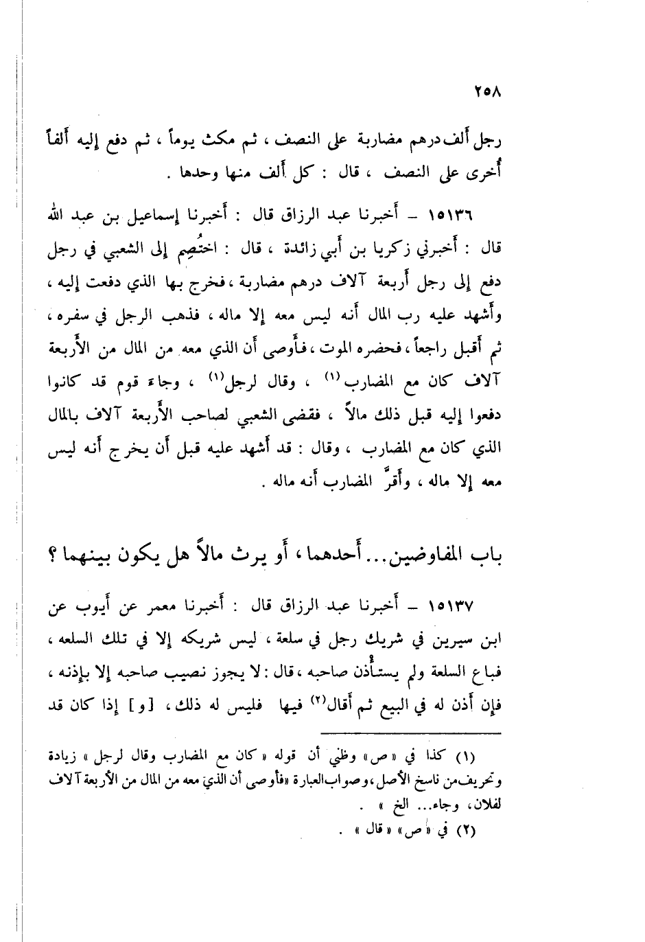 15138 - عَبْدُ الرَّزَّاقِ قَالَ: أَخْبَرَنَا الثَّوْرِيُّ، عَنْ أَشْعَثَ، عَنِ ابْنِ سِيرِينَ قَالَ: «§الْمُفَاوَضَةُ فِي الْمَالِ أَجْمَعَ»، وَكَانَ ابْنُ سِيرِينَ يُنْكِرُ الْمِيرَاثَ يَقُولُ: «هُوَ لِمَنْ وَرِثَهُ، إِذَا وَرِثَ أَحَدُ الْمُتَفَاوِضَيْنِ»، قَالَ: وَكَانَ ابْنُ أَبِي لَيْلَى يَقُولُ: «الْمُتَفَاوِضَيْنِ إِذَا وَرِثَ أَحَدُهُمَا مَالًا يُشْرِكُ الْآخَرَ مَعَهُ»