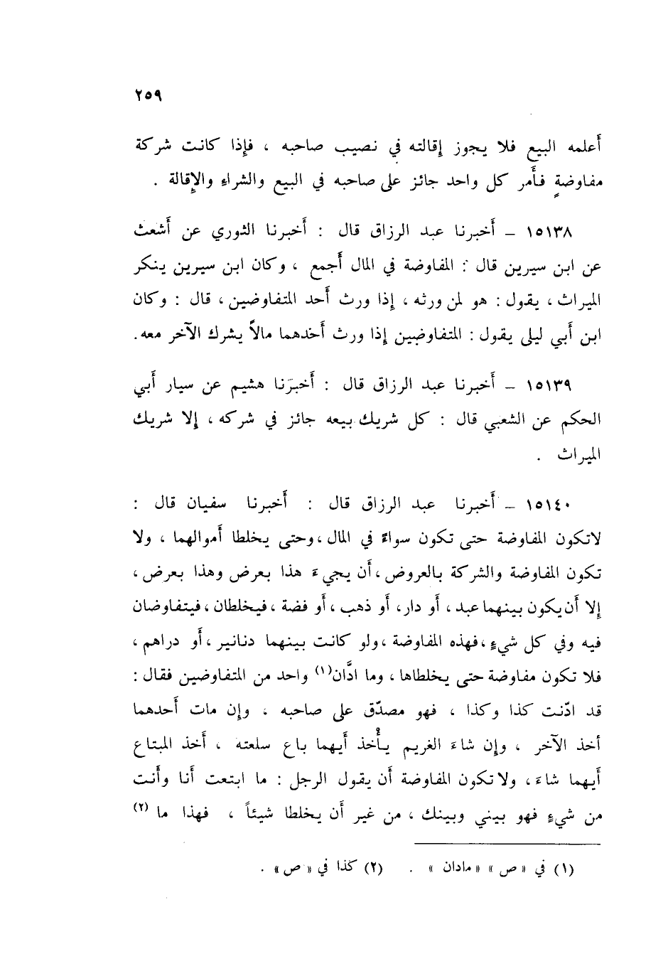 15140 - عَبْدُ الرَّزَّاقِ قَالَ: أَخْبَرَنَا سُفْيَانُ قَالَ: " §لَا تَكُونُ الْمُفَاوَضَةُ حَتَّى تَكُونَ سَوَاءً فِي الْمَالِ، وَحَتَّى يُخْلِطَا أَمْوَالَهُمَا، وَلَا تَكُونُ الْمُفَاوَضَةُ وَالشَّرِكَةُ بِالْعُرُوضِ، أَنْ يَجِيءَ هَذَا بِعَرْضٍ وَهَذَا بِعَرْضٍ، إِلَّا أَنْ يَكُونَ بَيْنَهُمَا عَبْدٌ أَوْ دَارٌ أَوْ ذَهَبٌ أَوْ فِضَّةٌ، فَيُخْلِطَانِ، فَيَتَفَاوَضَانِ فِيهِ وَفِي كُلِّ شَيْءٍ، فَهَذِهِ الْمُفَاوَضَةُ، وَلَوْ كَانَتْ بَيْنَهُمَا دَنَانِيرُ أَوْ دَرَاهِمُ، فَلَا تَكُونُ مُفَاوَضَةً حَتَّى يَخْلِطَاهَا، وَمَا ادَّانَ وَاحِدٌ مِنَ الْمُتَفَاوِضَيْنِ فَقَالَ: قَدِ ادَّنْتُ كَذَا وَكَذَا، فَهُوَ مُصَدِّقٌ عَلَى صَاحِبِهِ، وَإِنْ مَاتَ أَحَدُهُمَا أَخَذَ الْآخَرُ، وَإِنْ شَاءَ الْغَرِيمُ يَأْخُذُ أَيُّهُمَا بَاعَ سِلْعَتَهُ، أَخَذَ الْمُبْتَاعُ أَيُّهُمَا شَاءَ، وَلَا تَكُونُ الْمُفَاوَضَةُ أَنْ يَقُولَ الرَّجُلُ: مَا ابْتَعْتُ أَنَا وَأَنْتَ مِنْ شَيْءٍ فَهُوَ بَيْنِي وَبَيْنَكَ مِنْ غَيْرِ أَنْ يُخْلِطَا شَيْئًا، فَهَذَا مَا -[260]- ادَّعَى وَاحِدٌ مِنْهُمَا أَنَّهُ اشْتَرَى، سُئِلَ الْبَيِّنَةَ أَنَّهُ ابْتَاعَ عَلَى صَاحِبِهِ إِذَا 000 عَلَى صَاحِبِهِ، وَإِنْ شَاءَ تَارَكَهُ "