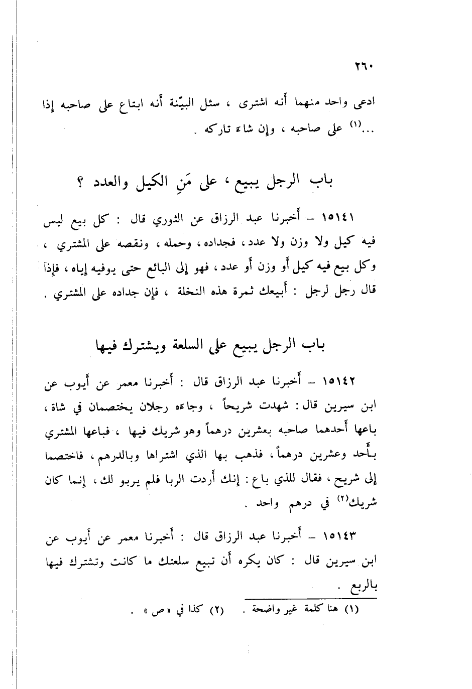 15142 - عَبْدُ الرَّزَّاقِ، أَخْبَرَنَا مَعْمَرٌ، عَنْ أَيُّوبَ، عَنِ ابْنِ سِيرِينَ قَالَ: شَهِدْتُ شُرَيْحًا وَجَاءَهُ §رَجُلَانِ يَخْتَصِمَانِ فِي شَاةٍ بَاعَهَا أَحَدُهُمَا صَاحِبَهُ بِعِشْرِينَ دِرْهَمًا، وَهُوَ شَرِيكٌ فِيهَا، فَبَاعَهَا الْمُشْتَرِي بِأَحَدٍ وَعِشْرِينَ دِرْهَمًا، فَذَهَبَ بِهَا الَّذِي اشْتَرَاهَا وَبِالدِّرْهَمِ، فَاخْتَصَمَا إِلَى شُرَيْحٍ، فَقَالَ لِلَّذِي بَاعَ: «إِنَّكَ أَرَدْتَ الرِّبَا فَلَمْ يَرْبُ لَكَ، إِنَّمَا كَانَ شَرِيكٌ فِي دِرْهَمٍ وَاحِدٍ»
