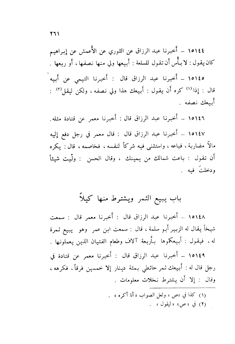 15149 - عَبْدُ الرَّزَّاقِ قَالَ: أَخْبَرَنَا مَعْمَرٌ، عَنْ قَتَادَةَ فِي §رَجُلٍ قَالَ لَهُ: أَبِيعُكَ ثَمَرَ حَائِطِي بِمِائَةِ دِينَارٍ إِلَّا خَمْسِينَ فِرْقًا، فَكَرِهَهُ، وَقَالَ: «إِلَّا أَنْ يَشْتَرِطَ نَخْلَاتٍ مَعْلُومَاتٍ»