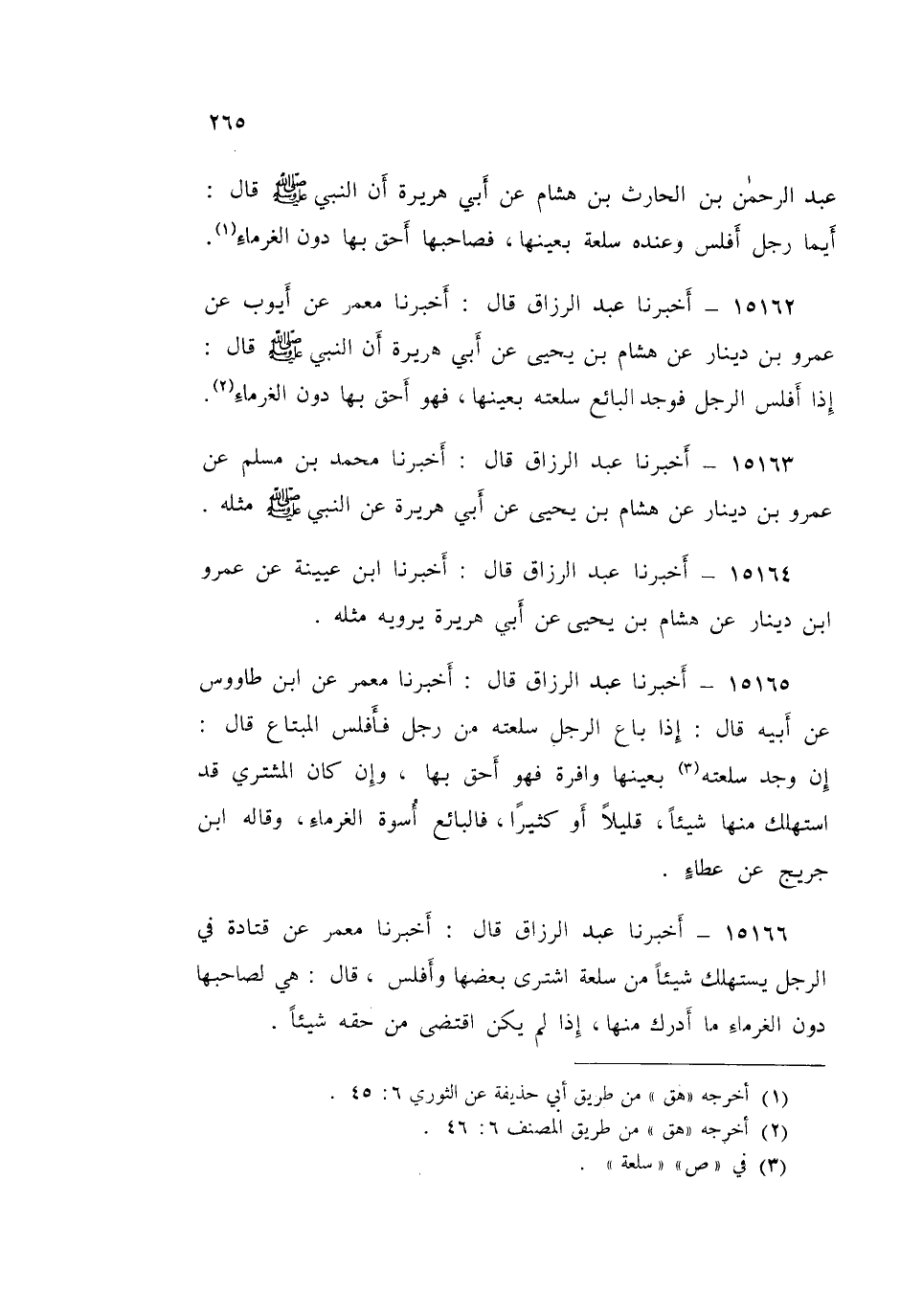 15165 - عَبْدُ الرَّزَّاقِ قَالَ: أَخْبَرَنَا مَعْمَرٌ، عَنِ ابْنِ طَاوُسٍ، عَنْ أَبِيهِ قَالَ: " §إِذَا بَاعَ الرَّجُلُ سِلْعَتَهُ مِنْ رَجُلٍ، فَأَفْلَسَ الْمُبْتَاعُ قَالَ: إِنْ وَجَدَ سِلْعَتَهُ بِعَيْنِهَا وَافِرَةً، فَهُوَ أَحَقُّ بِهَا وَإِنْ كَانَ الْمُشْتَرِي قَدِ اسْتَهْلَكَ مِنْهَا شَيْئًا قَلِيلًا، أَوْ كَثِيرًا، فَالْبَائِعُ أُسْوَةُ الْغُرَمَاءِ "، وَقَالَهُ ابْنُ جُرَيْجٍ، عَنْ عَطَاءٍ