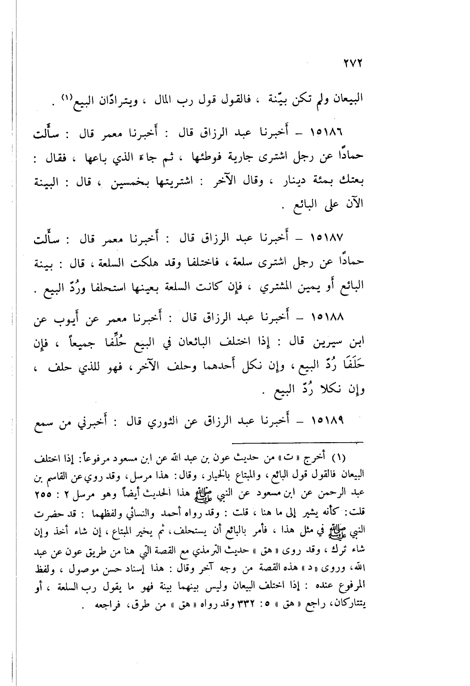15187 - عَبْدُ الرَّزَّاقِ قَالَ: أَخْبَرَنَا مَعْمَرٌ قَالَ: سَأَلْتُ حَمَّادًا عَنْ §رَجُلٍ اشْتَرَى سِلْعَةً فَاخْتَلَفَا وَقَدْ هَلَكَتِ السِّلْعَةُ قَالَ: «بَيِّنَةُ الْبَائِعِ، أَوْ يَمِينُ الْمُشْتَرِي، فَإِنْ كَانَتِ السِّلْعَةُ بِعَيْنِهَا، اسْتُحْلِفَا وَرُدَّ الْبَيْعُ»