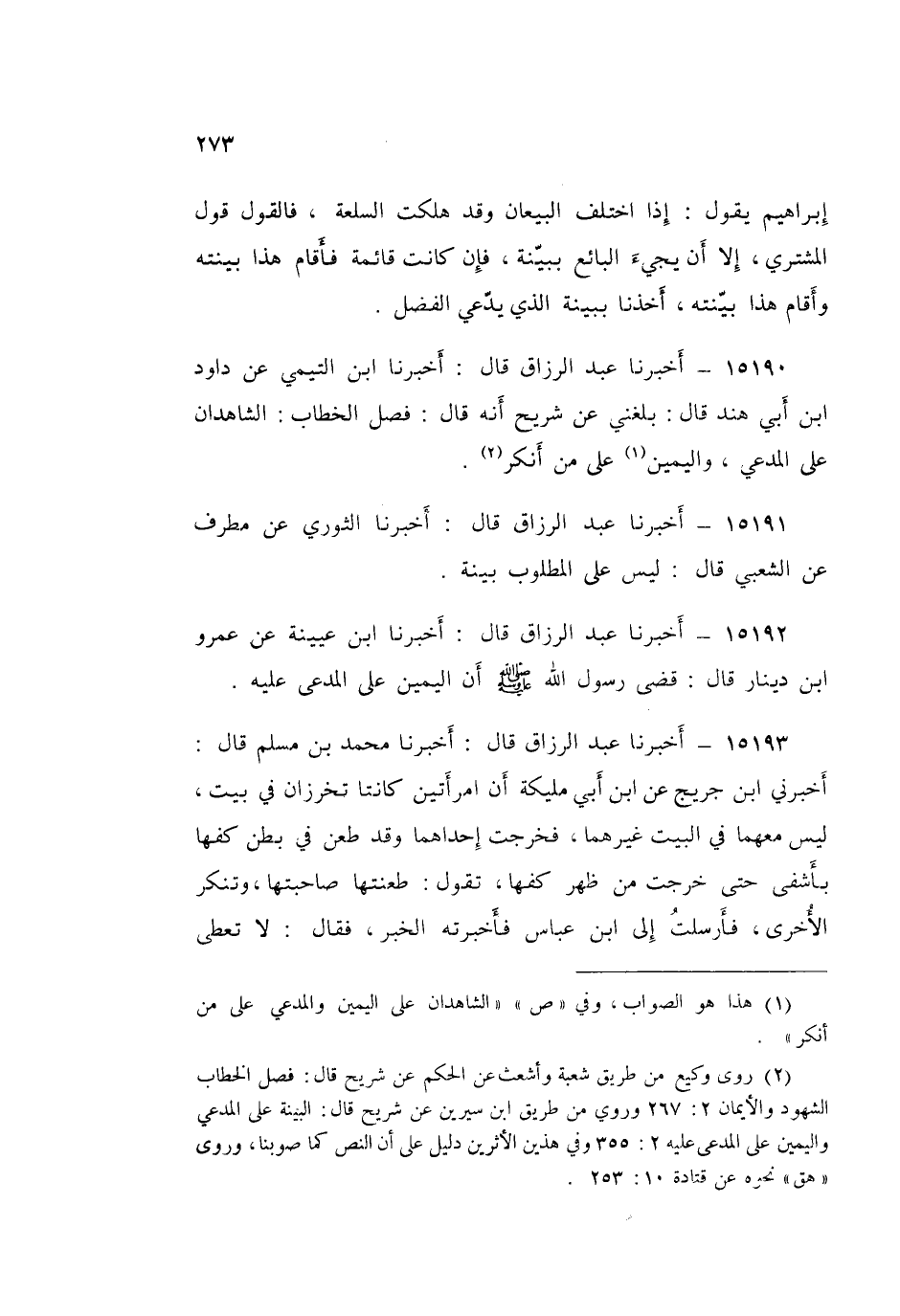 15192 - عَبْدُ الرَّزَّاقِ قَالَ: أَخْبَرَنَا ابْنُ عُيَيْنَةَ، عَنْ عَمْرِو بْنِ دِينَارٍ قَالَ: «§قَضَى رَسُولُ اللَّهِ صَلَّى اللهُ عَلَيْهِ وَسَلَّمَ أَنَّ الْيَمِينَ عَلَى الْمُدَّعَى عَلَيْهِ»
