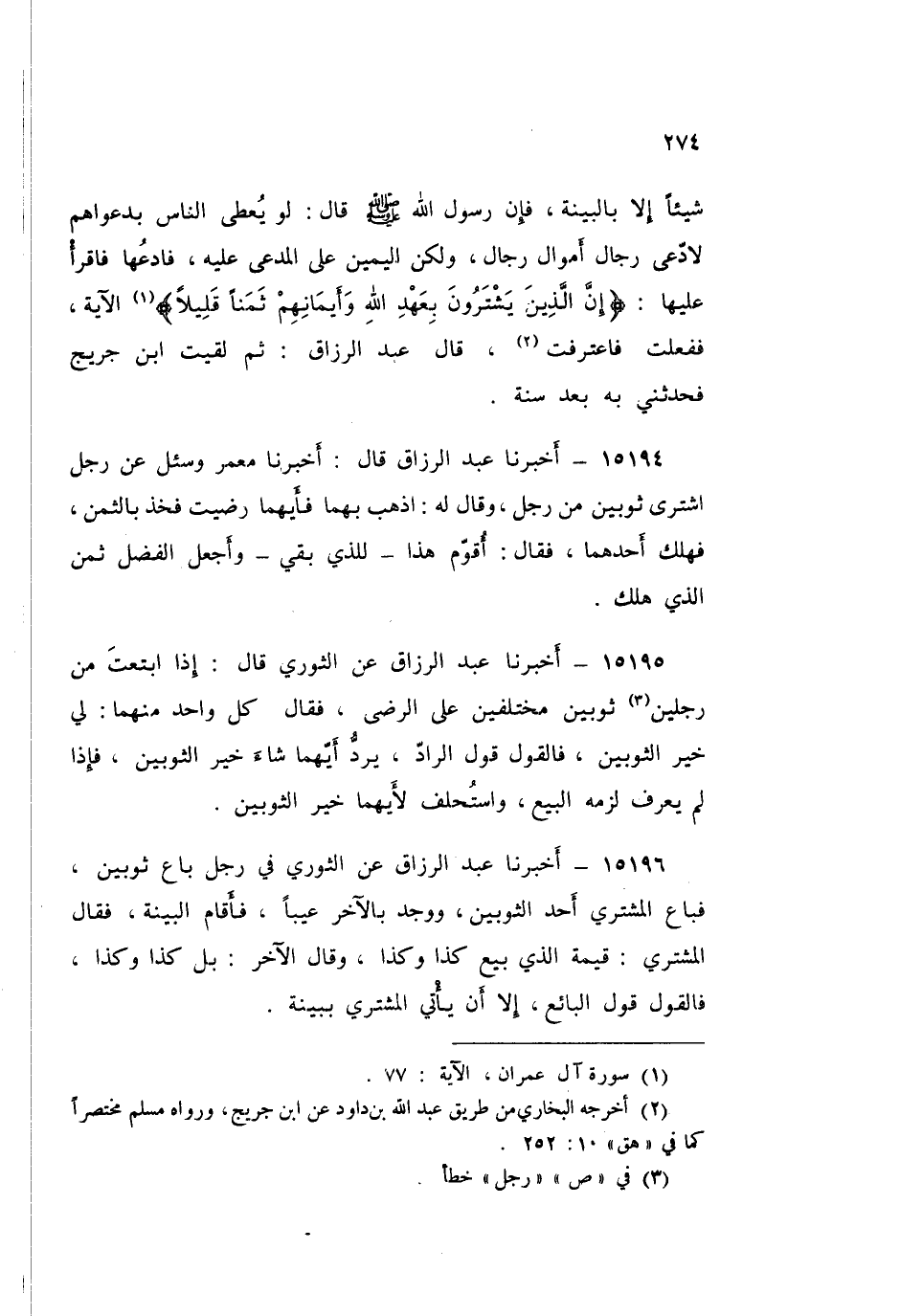 15196 - أَخْبَرَنَا عَبْدُ الرَّزَّاقِ، عَنِ الثَّوْرِيِّ فِي §رَجُلٍ بَاعَ ثَوْبَيْنِ فَبَاعَ الْمُشْتَرِي أَحَدَ الثَّوْبَيْنِ، وَوَجَدَ بِالْآخَرِ عَيْبًا، فَأَقَامَ الْبَيِّنَةَ فَقَالَ الْمُشْتَرِي: قِيمَةُ الَّذِي بِيعَ كَذَا وَكَذَا، وَقَالَ الْآخَرُ: بَلْ كَذَا وَكَذَا فَالْقَوْلُ قَوْلُ الْبَائِعِ، إِلَّا أَنْ يَأْتِيَ الْمُشْتَرِي بِبَيِّنَةٍ " أَخْبَرَنَا