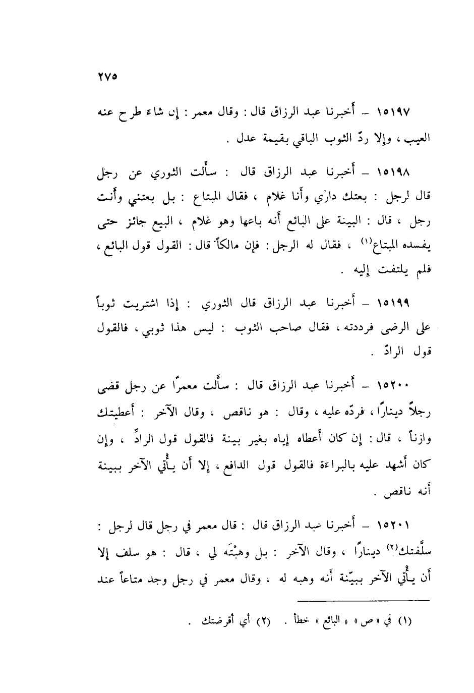 15200 - عَبْدُ الرَّزَّاقِ قَالَ: قَالَ: سَأَلْتُ مَعْمَرًا، عَنْ §رَجُلٍ قَضَى رَجُلًا دِينَارًا، فَرَدَّهُ عَلَيْهِ وَقَالَ: هُوَ نَاقِصٌ، وَقَالَ الْآخَرُ: أَعْطَيْتُكَ وَازِنًا قَالَ: «إِنْ كَانَ أَعْطَاهُ إِيَّاهُ بِغَيْرِ بَيِّنَةٍ، فَالْقَوْلُ قَوْلُ الرَّادِّ، وَإِنْ كَانَ أَشْهَدَ عَلَيْهِ بِالْبَرَاءَةِ، فَالْقَوْلُ قَوْلُ الدَّافِعِ، إِلَّا أَنْ يَأْتِيَ الْآخَرُ بِبَيِّنَةٍ أَنَّهُ نَاقِصٌ»