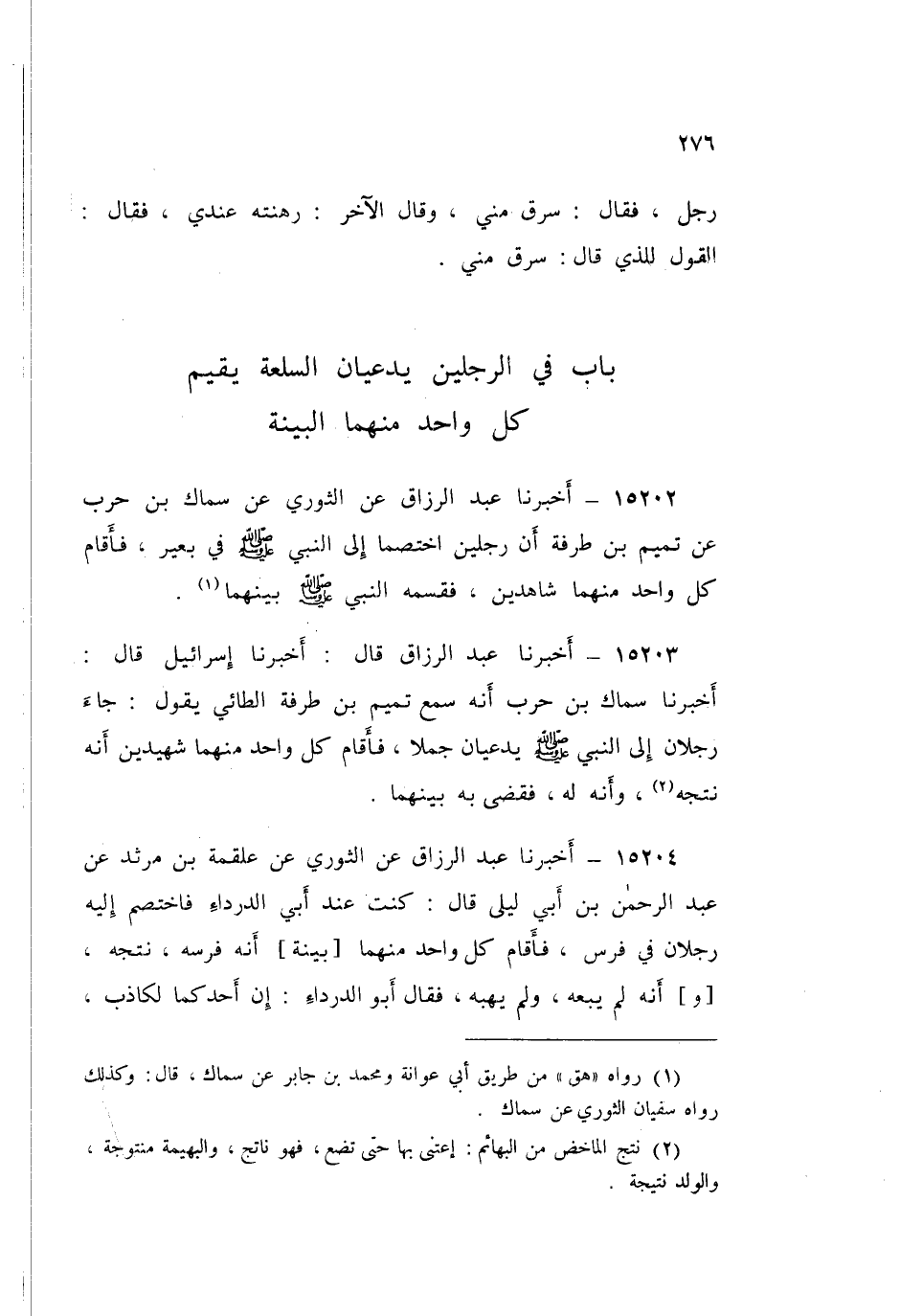 15203 - عَبْدُ الرَّزَّاقِ قَالَ: أَخْبَرَنَا إِسْرَائِيلُ، أَخْبَرَنَا سِمَاكُ بْنُ حَرْبٍ، أَنَّهُ سَمِعَ تَمِيمَ بْنَ طَرَفَةَ الطَّائِيَّ يَقُولُ: «§جَاءَ رَجُلَانِ إِلَى النَّبِيِّ صَلَّى اللهُ عَلَيْهِ وَسَلَّمَ يَدَّعِيَانِ جَمَلًا، فَأَقَامَ كُلُّ وَاحِدٍ مِنْهُمَا شَهِيدَيْنِ أَنَّهُ نَتَجَهُ، وَأَنَّهُ لَهُ فَقَضَى بِهِ بَيْنَهُمَا»