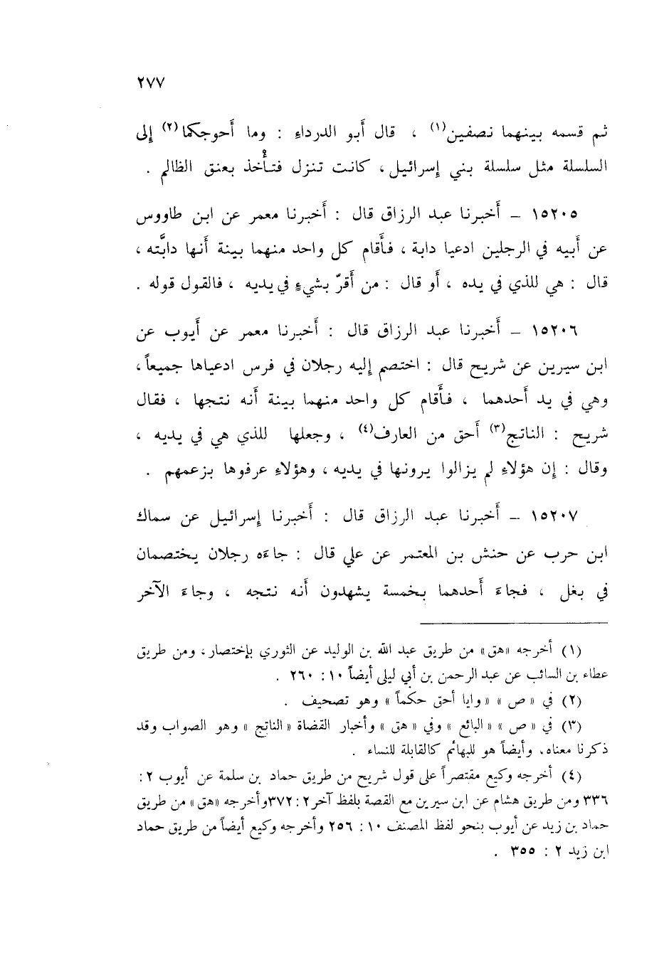 15206 - عَبْدُ الرَّزَّاقِ قَالَ: أَخْبَرَنَا مَعْمَرٌ، عَنْ أَيُّوبَ، عَنِ ابْنِ سِيرِينَ، عَنْ شُرَيْحٍ قَالَ: اخْتَصَمَ إِلَيْهِ رَجُلَانِ فِي فَرَسٍ ادَّعَيَاهَا جَمِيعًا، وَهِيَ فِي يَدِ أَحَدِهِمَا، فَأَقَامَ كُلُّ وَاحِدٍ مِنْهُمَا بَيِّنَةً أَنَّهُ نَتَجَهَا، فَقَالَ شُرَيْحٌ: «§النَّاتِجُ أَحَقُّ مِنَ الْعَارِفِ»، وَجَعَلَهَا لِلَّذِي هِيَ فِي يَدَيْهِ، وَقَالَ: «إِنَّ هَؤُلَاءِ لَمْ يَزَالُوا يَرَوْنَهَا فِي يَدَيْهِ، وَهَؤُلَاءِ عَرَفُوهَا بِزَعْمِهِمْ»