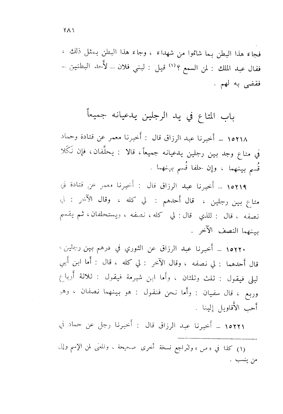 15219 - عَبْدُ الرَّزَّاقِ قَالَ: أَخْبَرَنَا مَعْمَرٌ، عَنْ قَتَادَةَ فِي §مَتَاعٍ بَيْنَ رَجُلَيْنِ قَالَ أَحَدُهُمْ: لِي كُلُّهُ، وَقَالَ الْآخَرُ: لِي نِصْفُهُ قَالَ: " لِلَّذِي قَالَ: لِي كُلُّهُ نِصْفُهُ، وَيُسْتَحْلَفَانِ ثُمَّ، يُقْسَمُ بَيْنَهُمَا النِّصْفُ الْآخَرُ "