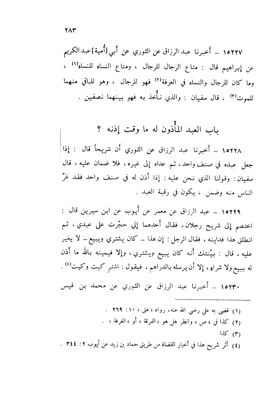 15230 - أَخْبَرَنَا عَبْدُ الرَّزَّاقِ، عَنِ الثَّوْرِيِّ، عَنْ مُحَمَّدِ بْنِ قَيْسٍ، عَنْ بَكَّارِ بْنِ سَلَّامٍ قَالَ: اخْتُصِمَ إِلَى عَلِيٍّ فِي §عَبْدٍ بَعَثَهُ سَيِّدُهُ يَبْتَاعَ فَقَالَ لَهُ: إِنَّهُ قَدْ بَعَثَهُ يَبْتَاعُ لَحْمًا بِدِرْهَمٍ «فَأَجَازَ عَلَيْهِ»، قَالَ سُفْيَانُ: وَنَحْنُ نَقُولُ: " إِذَا بَعَثَهُ بِمَالٍ كَثِيرٍ يَبْتَاعُ بِهِ قُلْنَا: أَذِنَ لَهُ فِي التِّجَارَةِ، وَغَرَّ النَّاسُ مِنْهُ، وَإِنْ كَانَ إِنَّمَا بَعَثَهُ بِالدِّرْهَمِ وَالدِّرْهَمَيْنِ، فَلَيْسَ بِشَيْءٍ "