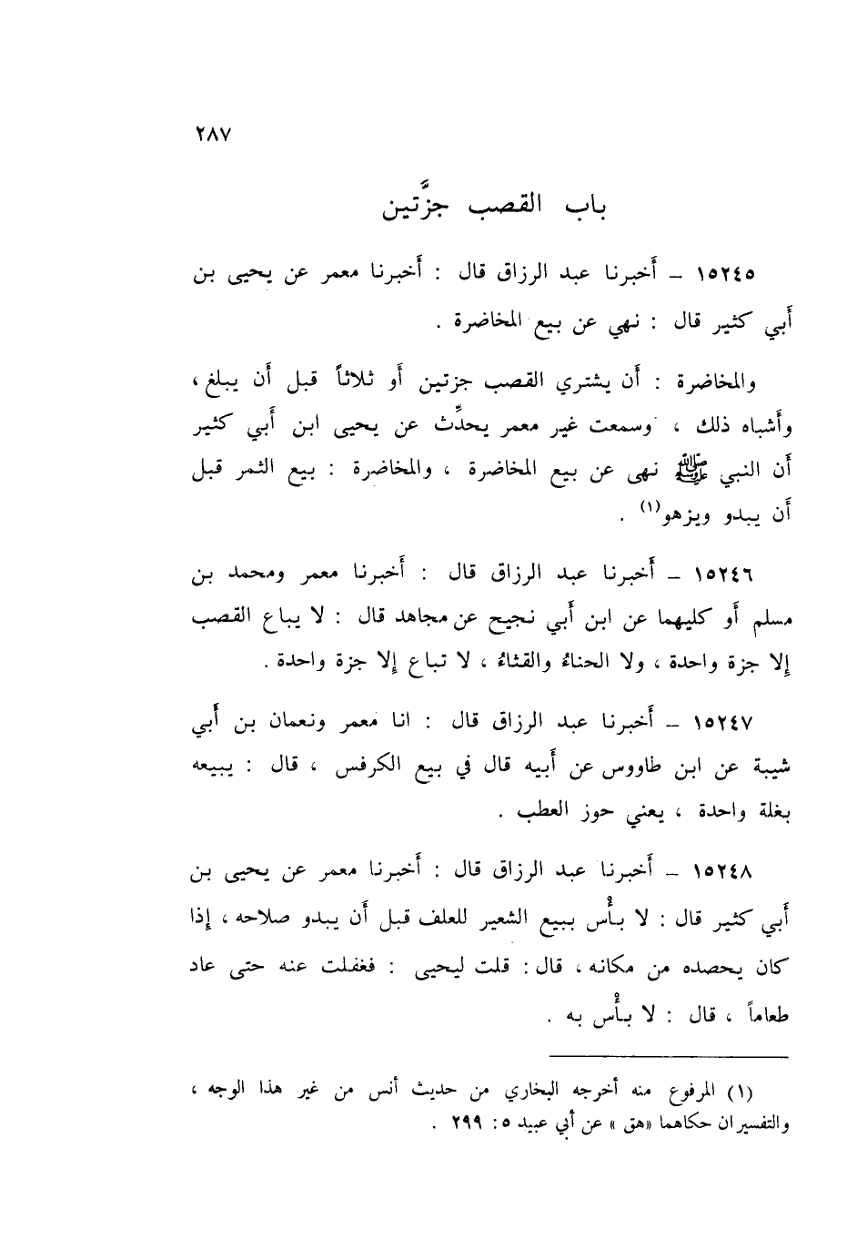 15245 - عَبْدُ الرَّزَّاقِ قَالَ: أَخْبَرَنَا مَعْمَرٌ، عَنْ يَحْيَى بْنِ أَبِي كَثِيرٍ قَالَ: «§نُهِيَ عَنْ بَيْعِ الْمُخَاضَرَةِ» وَالْمُخَاضَرَةُ: أَنْ يَشْتَرِيَ الْقَصَبَ جَزَّتَيْنِ أَوْ ثَلَاثًا قَبْلَ أَنْ يَبْلُغَ، وَأَشْبَاهُ ذَلِكَ "