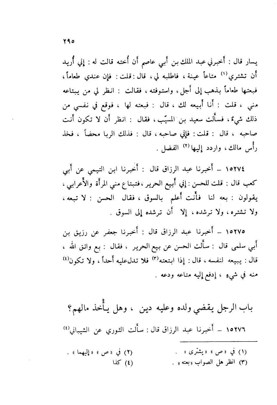 15275 - عَبْدُ الرَّزَّاقِ قَالَ: أَخْبَرَنَا جَعْفَرٌ، عَنْ رُزَيْقِ بْنِ أَبِي سَلْمَى قَالَ: سَأَلْتُ الْحَسَنَ عَنْ §بَيْعِ الْحَرِيرِ، فَقَالَ: «بِعْ، وَاتَّقِ اللَّهَ» قَالَ: يَبِيعُهُ لِنَفْسِهِ قَالَ: «إِذَا ابْتَعْتَهُ، فَلَا تَدُلَّ عَلَيْهِ أَحَدًا، وَلَا تَكُنْ مِنْهُ فِي شَيْءٍ، ادْفَعْ إِلَيْهِ مَتَاعَهُ وَدَعْهُ»