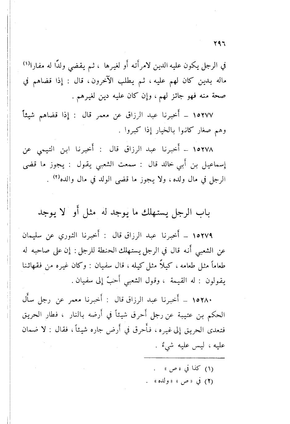 15278 - عَبْدُ الرَّزَّاقِ قَالَ: أَخْبَرَنَا ابْنُ التَّيْمِيِّ، عَنْ إِسْمَاعِيلَ بْنِ أَبِي خَالِدٍ قَالَ: سَمِعْتُ الشَّعْبِيَّ يَقُولُ: «§يَجُوزُ مَا قَضَى الرَّجُلُ فِي مَالِ وَلَدِهِ، وَلَا يَجُوزُ مَا قَضَى الْوَلَدُ فِي مَالِ وَالِدَهِ»