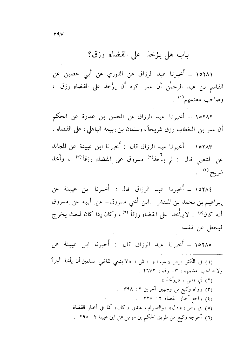 15281 - أَخْبَرَنَا عَبْدُ الرَّزَّاقِ، عَنِ الثَّوْرِيِّ، عَنْ أَبِي حُصَيْنٍ، عَنِ الْقَاسِمِ بْنِ عَبْدِ الرَّحْمَنِ، «أَنَّ عُمَرَ §كَرِهَ أَنْ يُؤْخَذَ عَلَى الْقَضَاءِ رِزْقٌ، وَصَاحِبِ مَغْنَمِهِمْ»