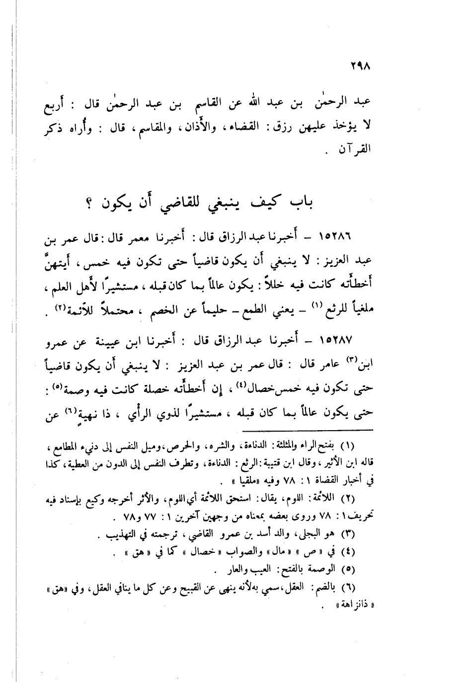 15286 - عَبْدُ الرَّزَّاقِ قَالَ: أَخْبَرَنَا مَعْمَرٌ قَالَ: قَالَ عُمَرُ بْنُ عَبْدِ الْعَزِيزِ: «§لَا يَنْبَغِي أَنْ يَكُونَ قَاضِيًا حَتَّى تَكُونَ فِيهِ خَمْسٌ، أَيَّتُهُنَّ أَخْطَأَتْهُ كَانَتْ فِيهِ خَلَلًا، يَكُونُ عَالِمًا بِمَا كَانَ قَبْلَهُ، مُسْتَشِيرًا لِأَهْلِ الْعِلْمِ، مُلْغِيًا لِلرَّثَعِ - يَعْنِي الطَّمَعَ - حَلِيمًا عَنِ الْخَصِمِ، مُحْتَمِلًا لِلَّائِمَةِ»