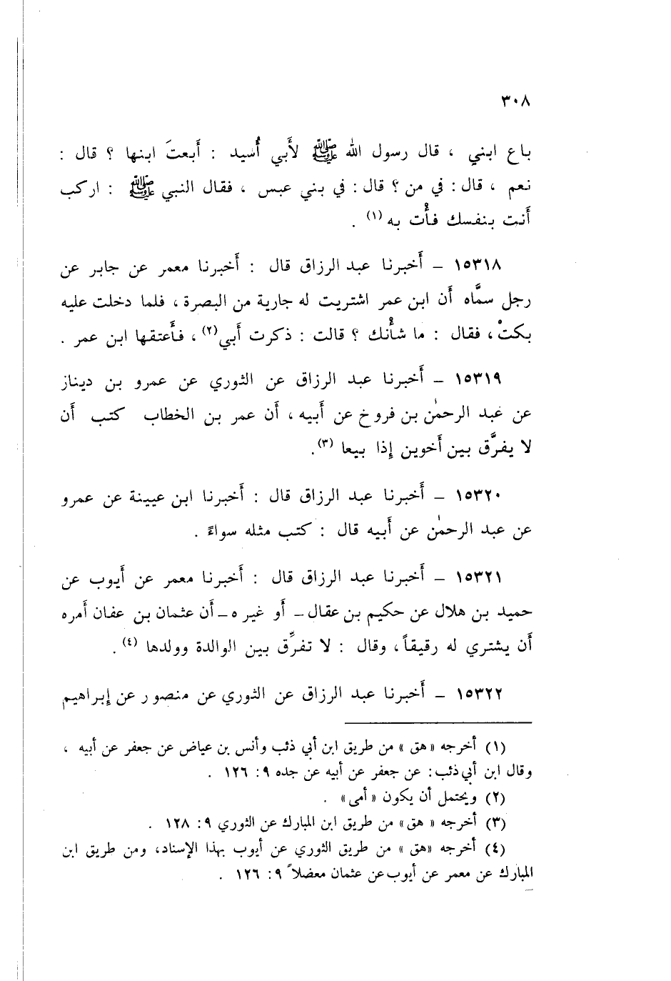 15321 - عَبْدُ الرَّزَّاقِ قَالَ: أَخْبَرَنَا مَعْمَرٌ، عَنْ أَيُّوبَ، عَنْ حُمَيْدِ بْنِ هِلَالٍ، عَنْ حَكِيمِ بْنِ عِقَالٍ، أَوْ غَيْرِهِ، أَنَّ عُثْمَانَ بْنَ عَفَّانَ، أَمَرَهُ أَنْ يَشْتَرِيَ لَهُ رَقِيقًا، وَقَالَ: «§لَا تُفَرِّقْ بَيْنَ الْوَالِدَةِ وَوَلَدِهَا»