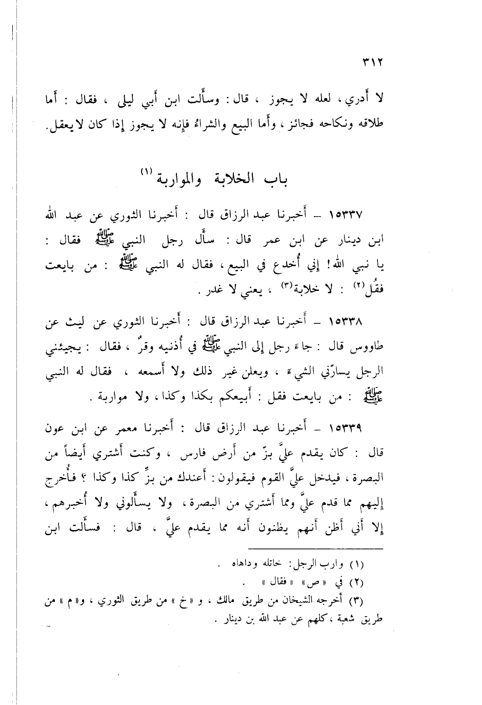 15337 - عَبْدُ الرَّزَّاقِ قَالَ: أَخْبَرَنَا الثَّوْرِيُّ، عَنْ عَبْدِ اللَّهِ بْنِ دِينَارٍ، عَنِ ابْنِ عُمَرَ قَالَ: سَأَلَ رَجُلٌ النَّبِيَّ صَلَّى اللهُ عَلَيْهِ وَسَلَّمَ فَقَالَ: يَا نَبِيَّ اللَّهِ، إِنِّي أُخْدَعُ فِي الْبَيْعِ، فَقَالَ لَهُ النَّبِيُّ صَلَّى اللهُ عَلَيْهِ وَسَلَّمَ: " §مَنْ بَايَعْتَ فَقُلْ: لَا خِلَابَةَ "، يَعْنِي لَا غَدْرَ