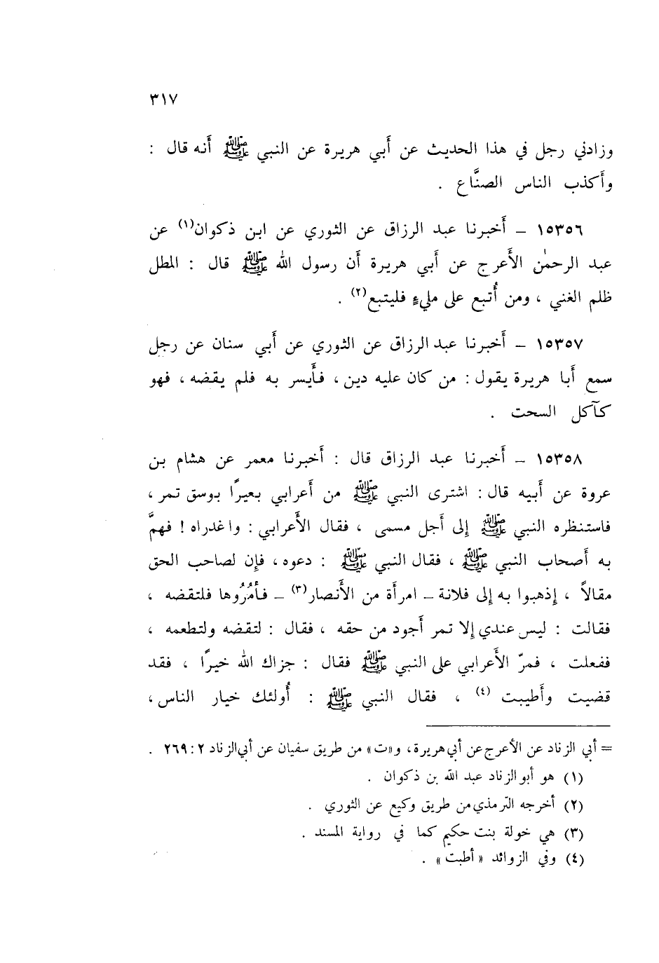 15358 - عَبْدُ الرَّزَّاقِ قَالَ: أَخْبَرَنَا مَعْمَرٌ، عَنْ هِشَامِ بْنِ عُرْوَةَ، عَنْ أَبِيهِ قَالَ: اشْتَرَى النَّبِيُّ صَلَّى اللهُ عَلَيْهِ وَسَلَّمَ مِنْ أَعْرَابِيٍّ بَعِيرًا بِوَسْقِ تَمْرٍ، فَاسْتَنْظَرَهُ النَّبِيُّ صَلَّى اللهُ عَلَيْهِ وَسَلَّمَ إِلَى أَجْلٍ مُسَمًّى، فَقَالَ الْأَعْرَابِيُّ: وَاغَدْرَاهُ، فَهَمَّ بِهِ أَصْحَابُ النَّبِيِّ صَلَّى اللهُ عَلَيْهِ وَسَلَّمَ، فَقَالَ النَّبِيُّ صَلَّى اللهُ عَلَيْهِ وَسَلَّمَ: «دَعُوهُ فَإِنَّ §لِصَاحِبِ الْحَقِّ مَقَالًا، اذْهَبُوا بِهِ إِلَى فُلَانَةٍ - امْرَأَةٌ مِنَ الْأَنْصَارِ - فَأْمُرُوهَا فَلْتَقْضِهِ»، فَقَالَتْ: لَيْسَ عِنْدِي إِلَّا تَمْرٌ أَجْوَدَ مِنْ حَقِّهِ، فَقَالَ: «لِتَقْضِهِ، وَلْتُطْعِمْهُ، فَفَعَلَتْ» فَمَرَّ الْأَعْرَابِيُّ عَلَى النَّبِيِّ صَلَّى اللهُ عَلَيْهِ وَسَلَّمَ فَقَالَ: جَزَاكَ اللَّهُ خَيْرًا فَقَدْ قَضَيْتَ وَأَطْيَبْتَ، فَقَالَ النَّبِيُّ صَلَّى اللهُ عَلَيْهِ وَسَلَّمَ: «أُولَئِكَ خِيَارُ النَّاسِ -[318]-، الْقَاضُونَ الْمُطِيبُونَ»