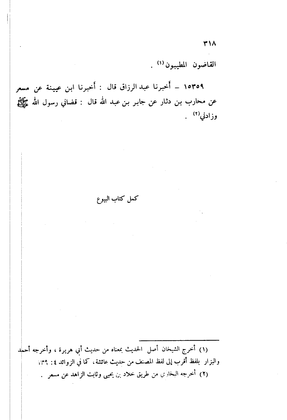 15359 - عَبْدُ الرَّزَّاقِ قَالَ: أَخْبَرَنَا ابْنُ عُيَيْنَةَ، عَنْ مِسْعَرٍ، عَنْ مُحَارِبِ بْنِ دِثَارٍ، عَنْ جَابِرِ بْنِ عَبْدِ اللَّهِ قَالَ: «§قَضَانِي رَسُولُ اللَّهِ صَلَّى اللهُ عَلَيْهِ وَسَلَّمَ وَزَادَنِي»
