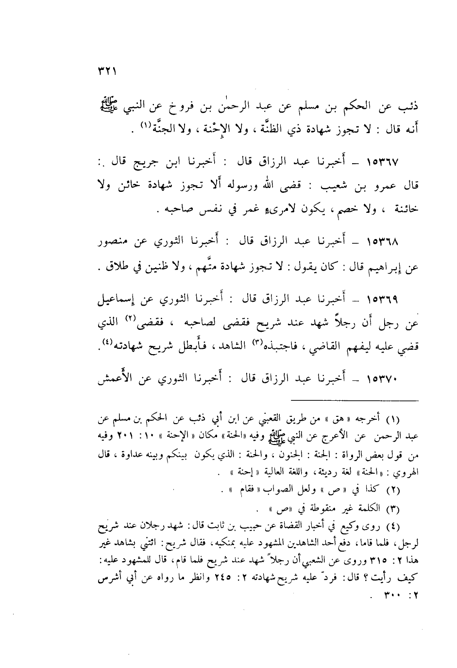 15368 - عَبْدُ الرَّزَّاقِ قَالَ: أَخْبَرَنَا الثَّوْرِيُّ، عَنْ مَنْصُورٍ، عَنْ إِبْرَاهِيمَ قَالَ: كَانَ يَقُولُ: «§لَا تَجُوزُ شَهَادَةُ مُتَّهَمٍ، وَلَا ظِنِّينٍ فِي طَلَاقٍ»