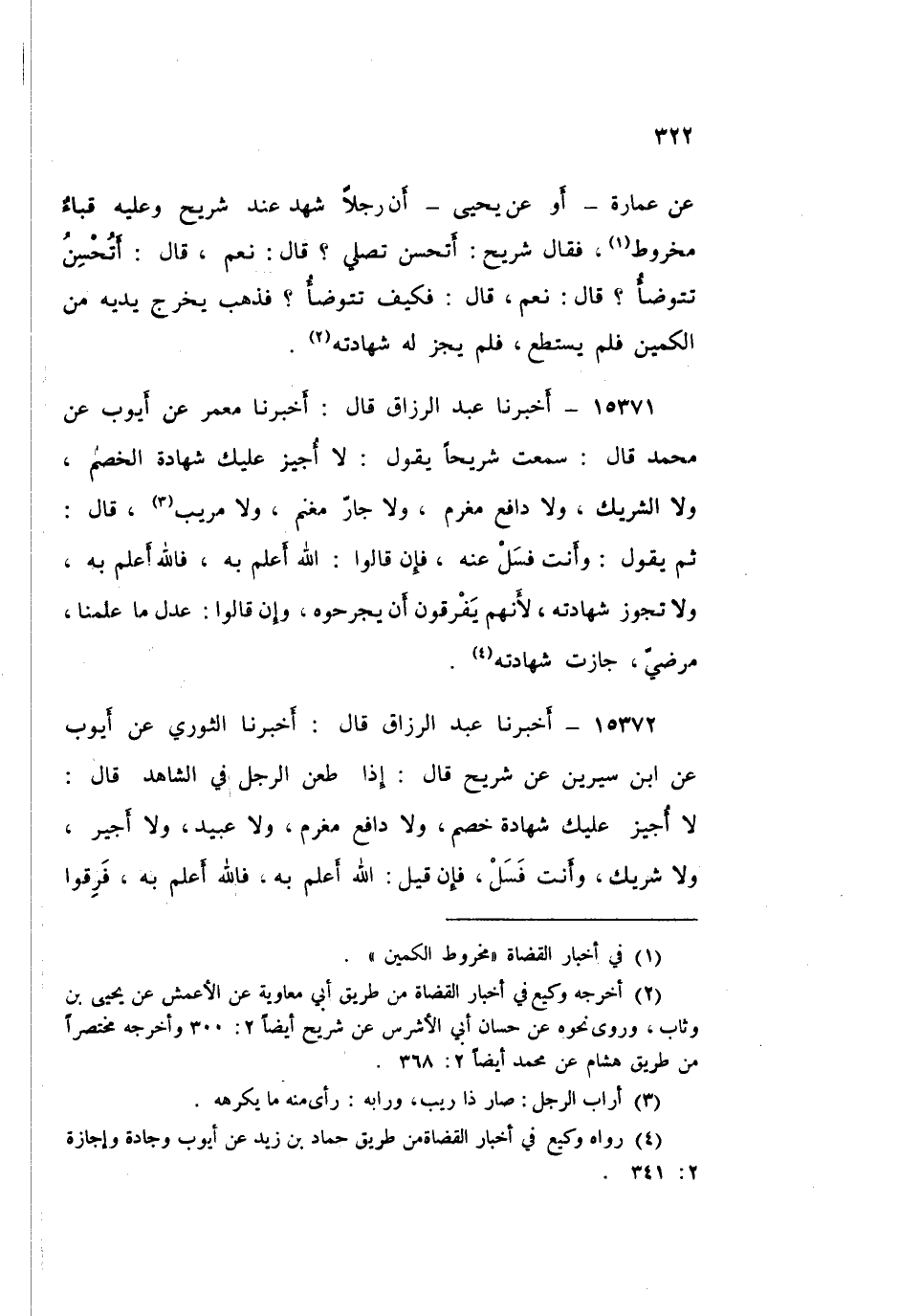15372 - عَبْدُ الرَّزَّاقِ قَالَ: أَخْبَرَنَا الثَّوْرِيُّ، عَنْ أَيُّوبَ، عَنِ ابْنِ سِيرِينَ، عَنْ شُرَيْحٍ قَالَ: " §إِذَا طَعَنَ الرَّجُلُ فِي الشَّاهِدِ قَالَ: لَا أُجِيزُ عَلَيْكَ شَهَادَةَ خَصْمٍ، وَلَا دَافِعِ مَغْرَمٍ، وَلَا عَبِيدٍ، وَلَا أَجِيرٍ، وَلَا شَرِيكٍ، وَأَنْتَ فَسَلْ، فَإِنْ قِيلَ: اللَّهُ أَعْلَمُ بِهِ، فَاللَّهُ أَعْلَمُ بِهِ فَرَقُوا أَنْ يَقُولُوا: مُرِيبٌ، فَلَا تَجُوزُ شَهَادَتُهُ، وَإِنْ قِيلَ: مَا عَلِمْنَاهُ إِلَّا عَدْلًا مُسْلِمًا، فَهُوَ إِنْ شَاءَ اللَّهُ كَمَا قَالُوا "