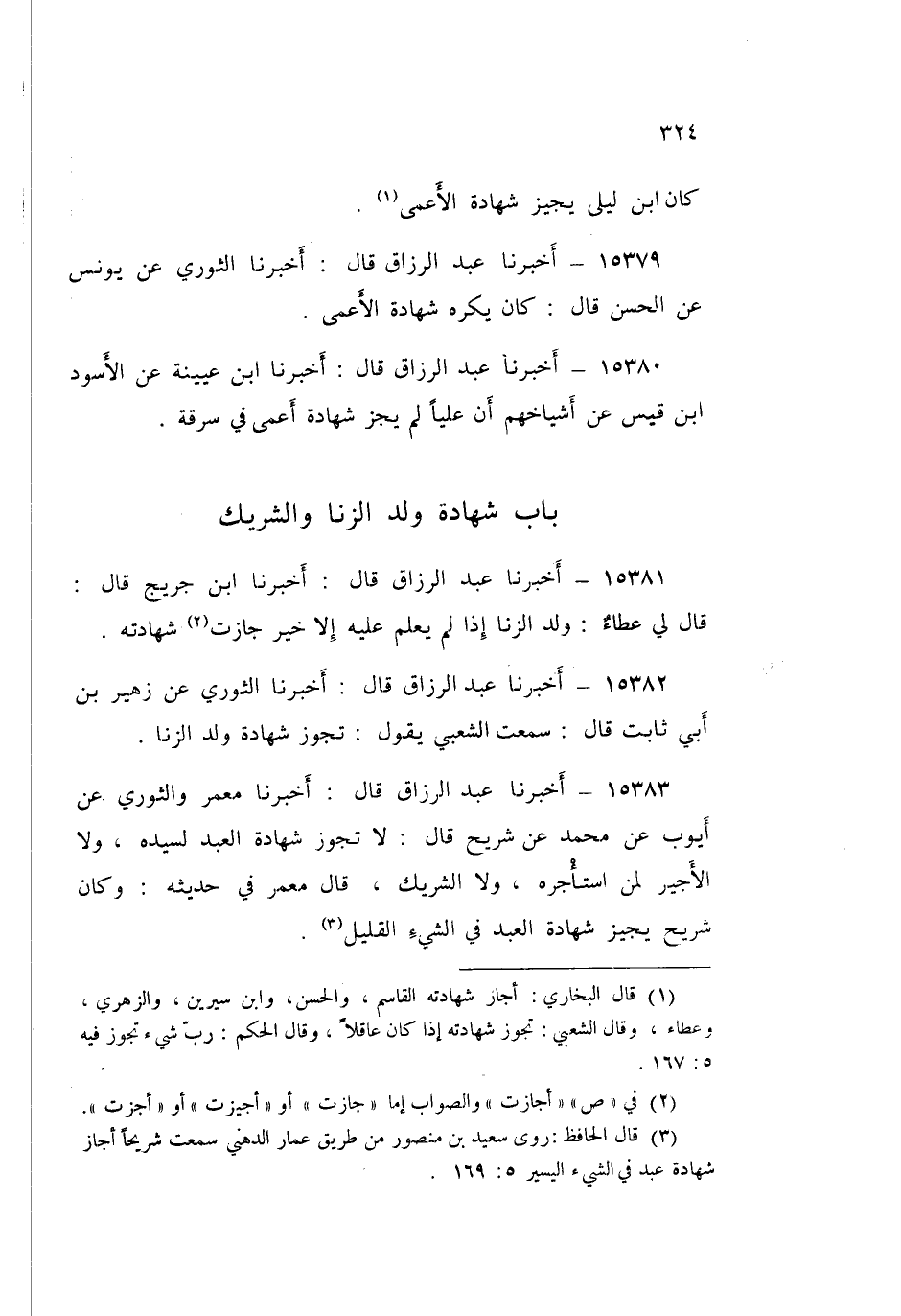15380 - عَبْدُ الرَّزَّاقِ قَالَ: أَخْبَرَنَا ابْنُ عُيَيْنَةَ، عَنِ الْأَسْوَدِ بْنِ قَيْسٍ، عَنْ أَشْيَاخِهِمْ، أَنَّ عَلِيًّا، «§لَمْ يُجِزْ شَهَادَةَ أَعْمَى فِي سَرِقَةٍ»