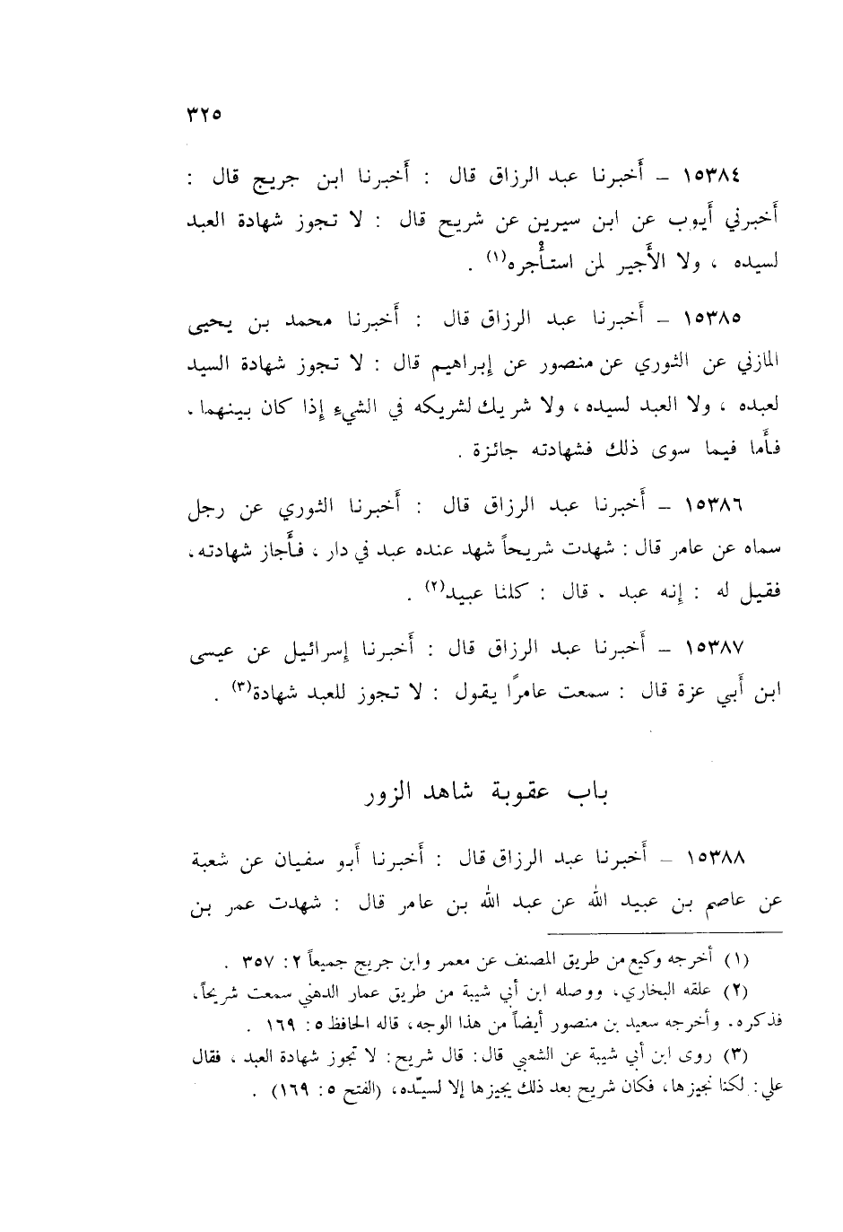 15387 - عَبْدُ الرَّزَّاقِ قَالَ: أَخْبَرَنَا إِسْرَائِيلُ، عَنْ عِيسَى بْنِ أَبِي عَزَّةَ قَالَ: سَمِعْتُ عَامِرًا يَقُولُ: «§لَا تَجُوزُ لِلْعَبْدِ شَهَادَةٌ»