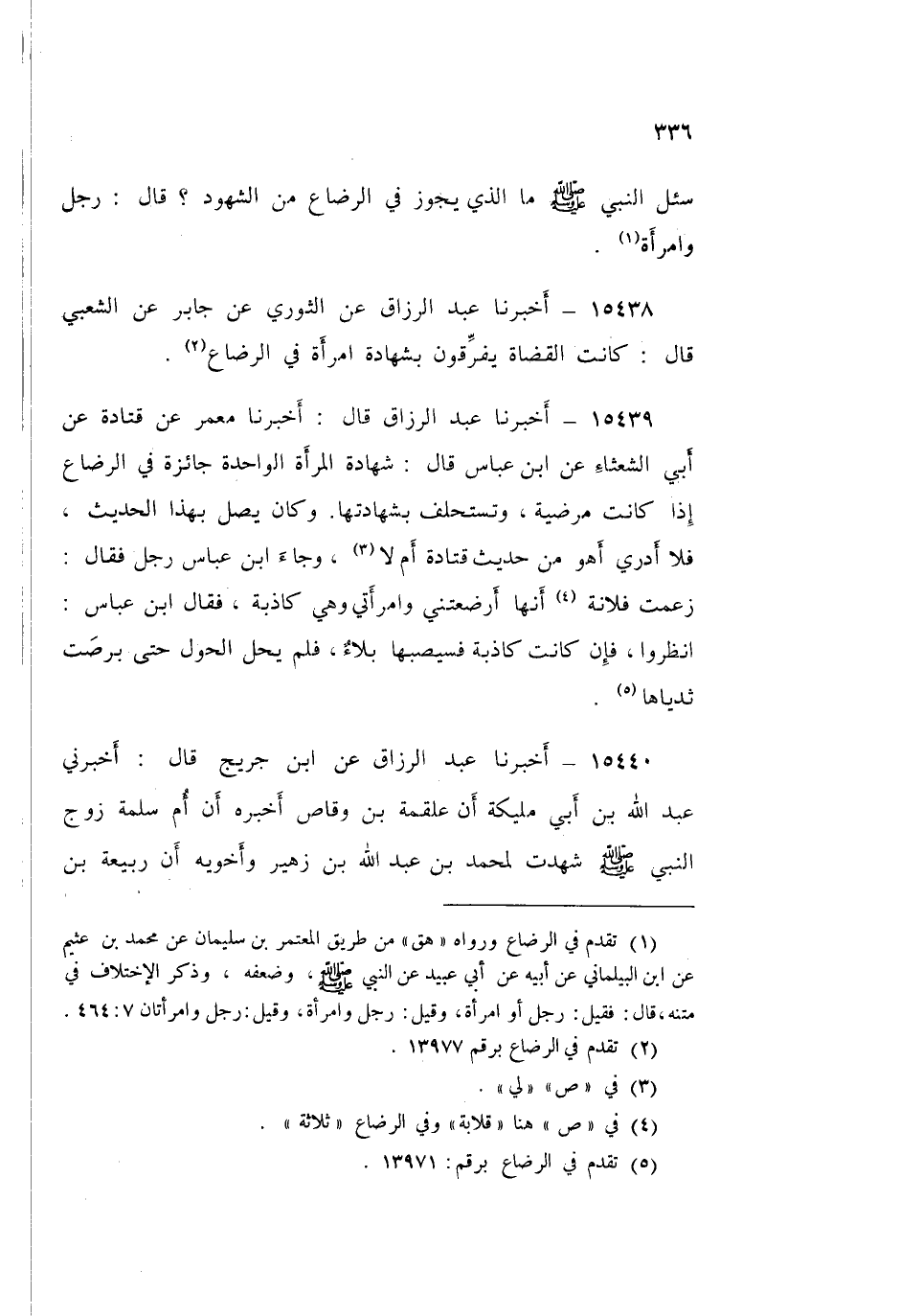 15439 - عَبْدُ الرَّزَّاقِ قَالَ: أَخْبَرَنَا مَعْمَرٌ، عَنْ قَتَادَةَ، عَنْ أَبِي الشَّعْثَاءِ، عَنِ ابْنِ عَبَّاسٍ قَالَ: «§شَهَادَةُ الْمَرْأَةِ الْوَاحِدَةِ جَائِزَةٌ فِي الرَّضَاعِ إِذَا كَانَتْ مَرْضِيَّةً، وَتُسْتَحْلَفُ بِشَهَادَتِهَا»، وَكَانَ يَصِلُ بِهَذَا الْحَدِيثِ، فَلَا أَدْرِي، أَهُوَ مِنْ حَدِيثِ قَتَادَةَ أَمْ لَا، وَجَاءَ ابْنَ عَبَّاسٍ رَجُلٌ فَقَالَ: زَعَمَتْ فُلَانَةٌ أَنَّهَا أَرْضَعَتْنِي وَامْرَأَتِي، وَهِيَ كَاذِبَةٌ، فَقَالَ ابْنُ عَبَّاسٍ: «انْظُرُوا فَإِنْ كَانَتْ كَاذِبَةً فَسَيُصِيبُهَا بَلَاءٌ»، فَلَمْ يَحُلِ الْحَوْلُ حَتَّى بَرَصَتْ ثَدْيَاهَا