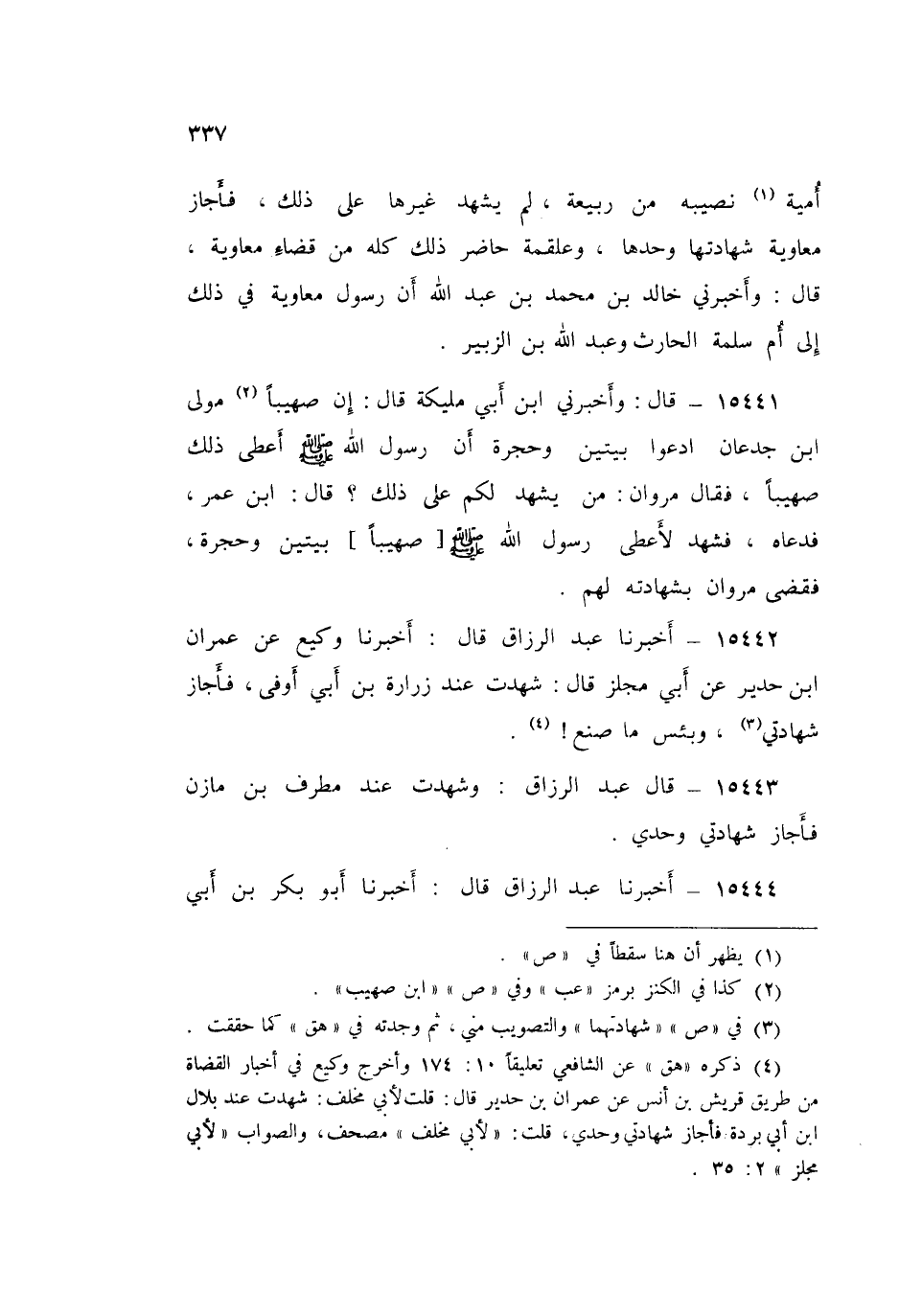15441 - قَالَ: وَأَخْبَرَنِي ابْنُ أَبِي مُلَيْكَةَ قَالَ: إِنَّ ابْنَ صُهَيْبٍ مَوْلَى ابْنِ جُدْعَانَ ادَّعُوا بَيْتَيْنِ وَحُجْرَةً أَنَّ رَسُولَ اللَّهِ صَلَّى اللهُ عَلَيْهِ وَسَلَّمَ أَعْطَى ذَلِكَ صُهَيْبًا، فَقَالَ مَرْوَانُ: مَنْ يَشْهَدُ لَكُمْ عَلَى ذَلِكَ؟ قَالَ: ابْنُ عُمَرَ، فَدَعَاهُ «§فَشَهِدَ لَأَعْطَى رَسُولُ اللَّهِ صَلَّى اللهُ عَلَيْهِ وَسَلَّمَ صُهَيْبًا بَيْتَيْنِ وَحُجْرَةً»، فَقَضَى مَرْوَانُ بِشَهَادَتِهِ لَهُمْ