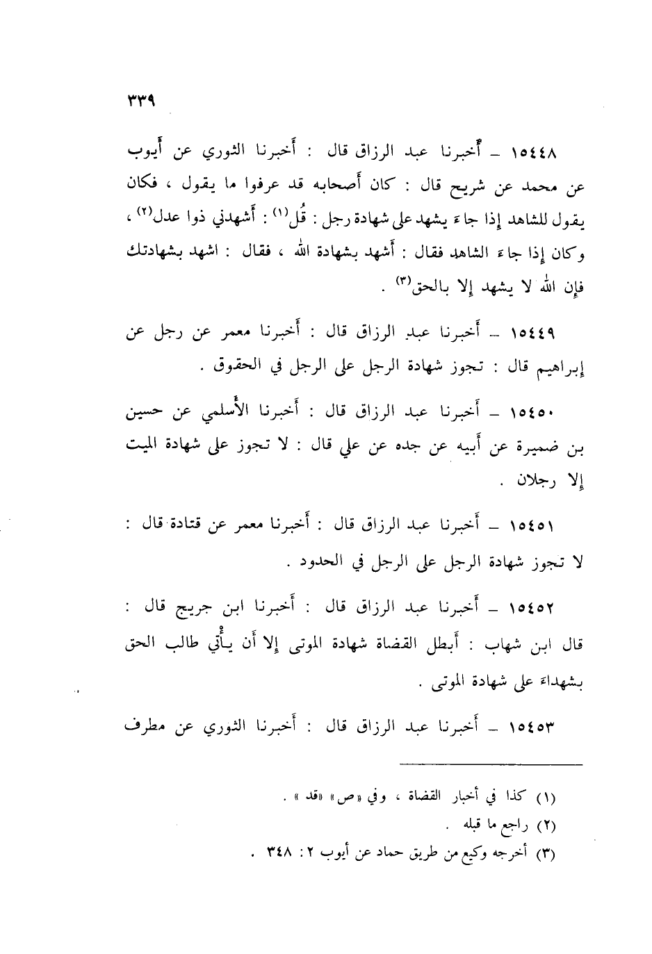 15452 - عَبْدُ الرَّزَّاقِ قَالَ: أَخْبَرَنَا ابْنُ جُرَيْجٍ قَالَ: وَقَالَ ابْنُ شِهَابٍ: «§أَبْطَلَ الْقُضَاةُ شَهَادَةَ الْمَوْتَى، إِلَّا أَنَّ يَأْتِيَ طَالِبُ الْحَقِّ بِشُهَدَاءَ عَلَى شَهَادَةِ الْمَوْتَى»