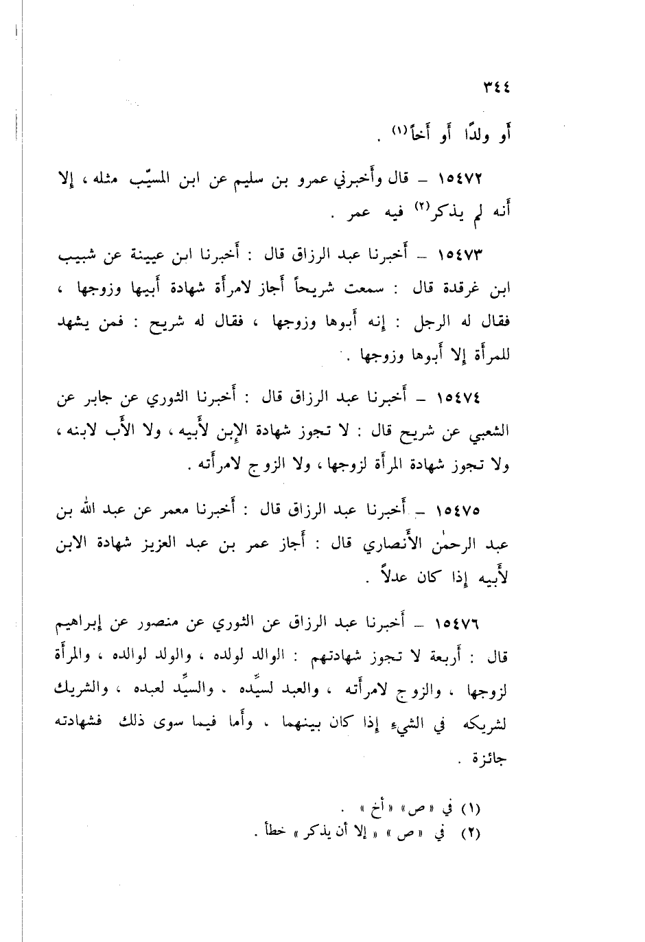 15476 - أَخْبَرَنَا عَبْدُ الرَّزَّاقِ قَالَ: عَنِ الثَّوْرِيِّ، عَنْ مَنْصُورٍ، عَنْ إِبْرَاهِيمَ قَالَ: " §أَرْبَعَةٌ لَا تَجُوزُ شَهَادَتُهُمْ: الْوَالِدُ لِوَلَدِهِ، وَالْوَلَدُ لِوَالِدِهِ، وَالْمَرْأَةُ لِزَوْجِهَا، وَالزَّوْجُ لِامْرَأَتِهِ، وَالْعَبْدُ لِسَيِّدِهِ، وَالسَّيِّدُ لِعَبْدِهِ، وَالشَّرِيكُ لِشَرِيكِهِ فِي الشَّيْءِ إِذَا كَانَ بَيْنَهُمَا، وَأَمَّا فِيمَا سِوَى ذَلِكَ فَشَهَادَتُهُ جَائِزَةٌ "، أَخْبَرَنَا