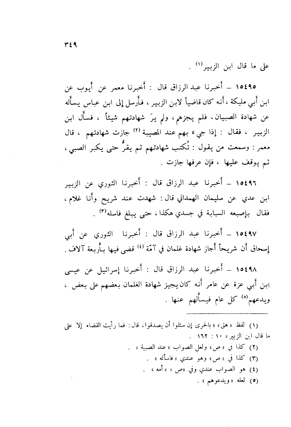 15499 - عَبْدُ الرَّزَّاقِ قَالَ: أَخْبَرَنَا ابْنُ جُرَيْجٍ قَالَ: «زَعَمَ إِسْمَاعِيلُ بْنُ مُحَمَّدٍ، وَيَعْقُوبُ بْنُ عُتْبَةَ، وَصَالِحٌ، أَنْ §لَيْسَ لِمَنْ لَمْ يَبْلُغِ الْحُلُمَ شَهَادَةٌ»
