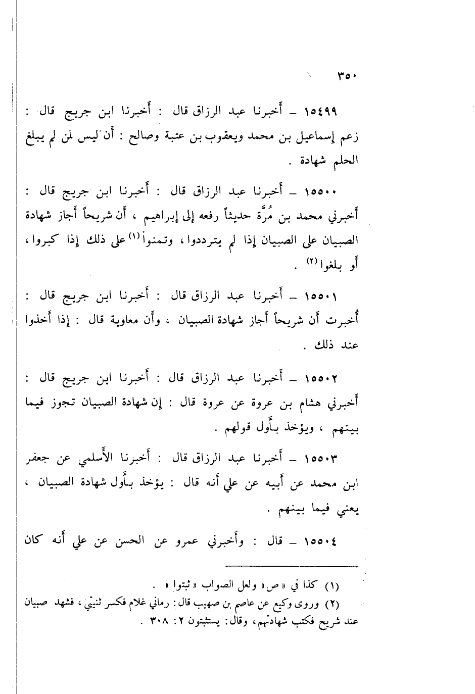 15501 - عَبْدُ الرَّزَّاقِ قَالَ: أَخْبَرَنَا ابْنُ جُرَيْجٍ قَالَ: أُخْبِرْتُ «أَنَّ شُرَيْحًا §أَجَازَ شَهَادَةَ الصِّبْيَانِ»، وَأَنَّ مُعَاوِيَةَ قَالَ: «إِذَا أُخِذُوا عِنْدَ ذَلِكَ»