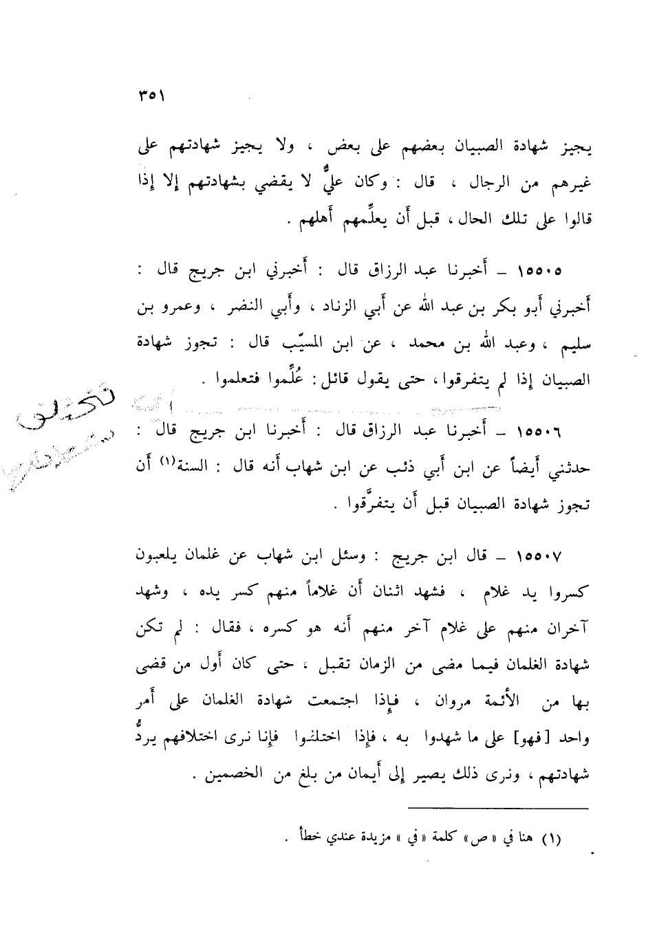 15506 - عَبْدُ الرَّزَّاقِ قَالَ: أَخْبَرَنَا ابْنُ جُرَيْجٍ قَالَ: حَدَّثَنِي أَيْضًا، عَنِ ابْنِ أَبِي ذِئْبٍ، عَنِ ابْنِ شِهَابٍ، أَنَّهُ قَالَ: «السُّنَّةُ أَنْ §تَجُوزَ شَهَادَةُ الصِّبْيَانِ قَبْلَ أَنْ يَتَفَرَّقُوا»