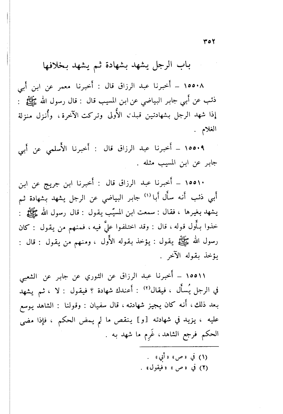 15510 - عَبْدُ الرَّزَّاقِ قَالَ: أَخْبَرَنَا ابْنُ جُرَيْجٍ، عَنِ ابْنِ أَبِي ذِئْبٍ، أَنَّهُ سَأَلَ أَبَا جَابِرٍ الْبَيَاضِيَّ عَنِ الرَّجُلِ يَشْهَدُ بِشَهَادَةٍ، ثُمَّ يَشْهَدُ بِغَيْرِهَا، فَقَالَ: سَمِعْتُ ابْنَ الْمُسَيِّبِ يَقُولُ: قَالَ رَسُولُ اللَّهِ صَلَّى اللهُ عَلَيْهِ وَسَلَّمَ: «خُذُوا بِأَوَّلِ قَوْلِهِ» قَالَ: وَقَدِ اخْتَلَفُوا عَلَيَّ فِيهِ، فَمِنْهُمْ مَنْ يَقُولُ: كَانَ رَسُولُ اللَّهِ صَلَّى اللهُ عَلَيْهِ وَسَلَّمَ يَقُولُ: «§يُؤْخَذُ بِقَوْلِهِ الْأَوَّلِ» وَمِنْهُمْ مَنْ يَقُولُ: قَالَ: «يُؤْخَذُ بِقَوْلِهِ الْآخِرِ»