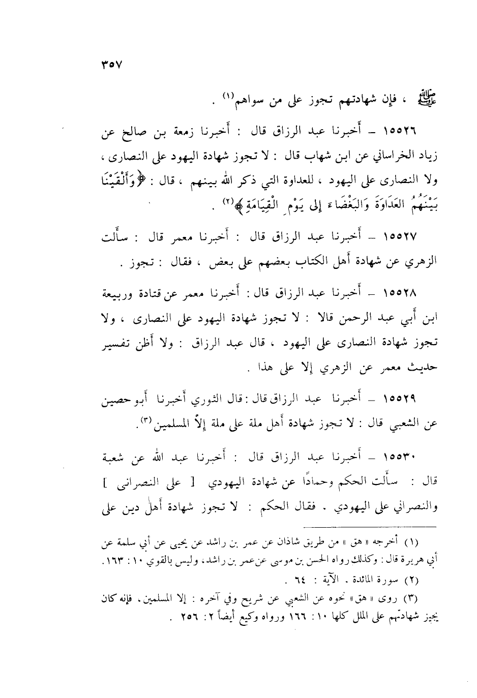 15528 - عَبْدُ الرَّزَّاقِ قَالَ: أَخْبَرَنَا مَعْمَرٌ، عَنْ قَتَادَةَ، وَرَبِيعَةَ بْنِ أَبِي عَبْدِ الرَّحْمَنِ، قَالَا: «§لَا تَجُوزُ شَهَادَةُ الْيَهُودِ عَلَى النَّصَارَى، وَلَا تَجُوزُ شَهَادَةُ النَّصَارَى عَلَى الْيَهُودِ» قَالَ عَبْدُ الرَّزَّاقِ: «وَلَا أَظُنُّ تَفْسِيرَ حَدِيثِ مَعْمَرٍ، عَنِ الزُّهْرِيِّ إِلَّا عَلَى هَذَا»