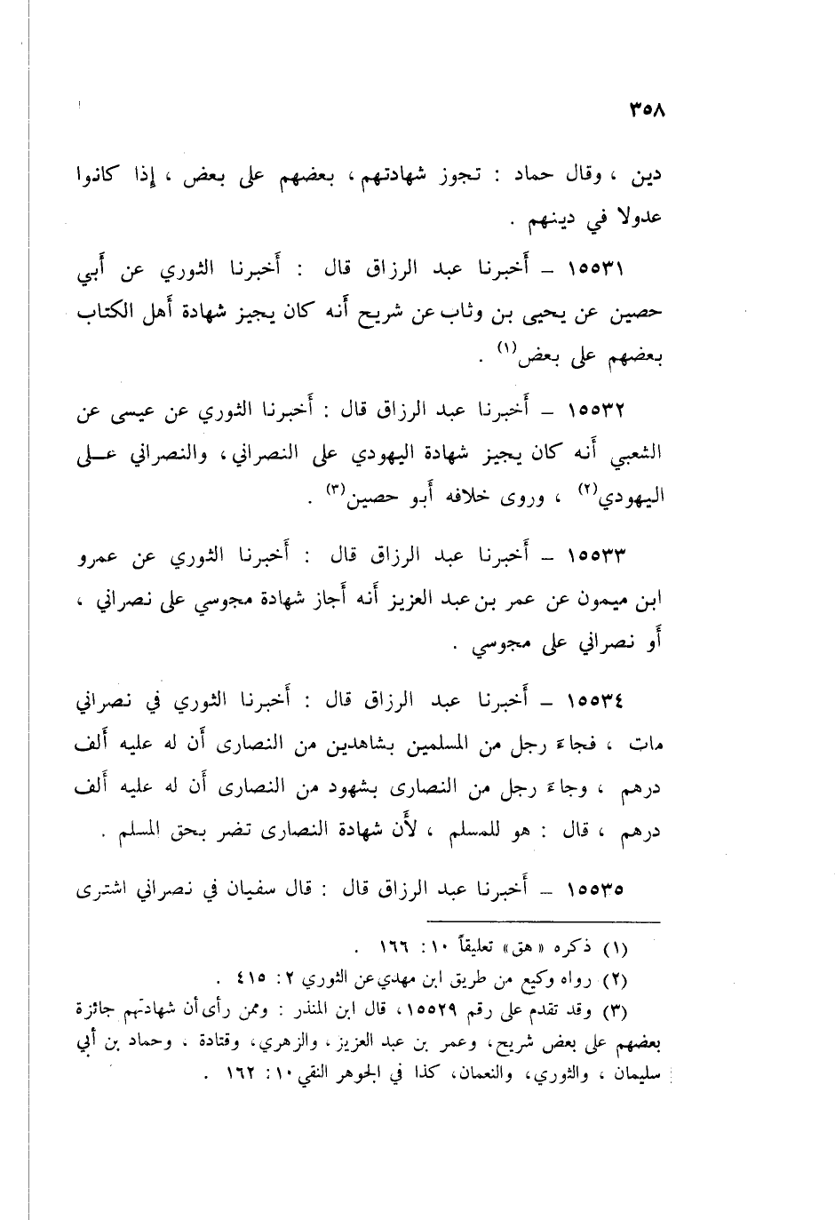15532 - عَبْدُ الرَّزَّاقِ قَالَ: أَخْبَرَنَا الثَّوْرِيُّ، عَنْ عِيسَى، عَنِ الشَّعْبِيِّ أَنَّهُ كَانَ §يُجِيزُ شَهَادَةَ الْيَهُودِيِّ عَلَى النَّصْرَانِيِّ، وَالنَّصْرَانِيِّ عَلَى الْيَهُودِيِّ "، وَرَوَى خِلَافَهُ أَبُو حُصَيْنٍ