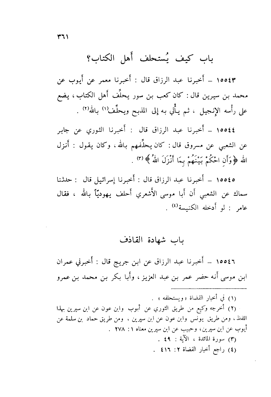 15543 - عَبْدُ الرَّزَّاقِ قَالَ: أَخْبَرَنَا مَعْمَرٌ، عَنْ أَيُّوبَ، عَنْ مُحَمَّدِ بْنِ سِيرِينَ قَالَ: «كَانَ كَعْبُ بْنُ سَوْرٍ §يُحَلِّفُ أَهْلَ الْكِتَابِ، يَضَعُ عَلَى رَأْسِهِ الْإِنْجِيلَ، ثُمَّ يَأْتِي بِهِ إِلَى الْمَذْبَحِ وَيُحَلِّفُ بِاللَّهِ»