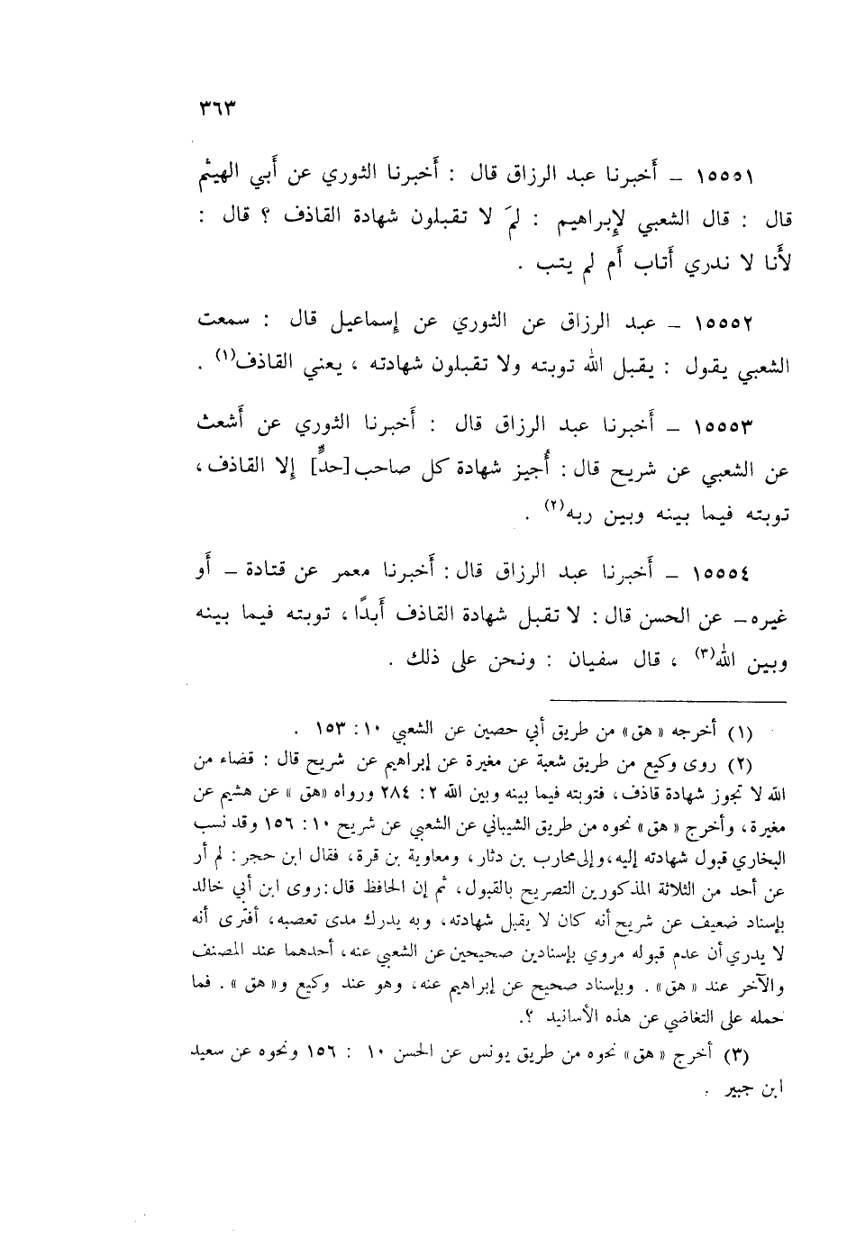 15553 - عَبْدُ الرَّزَّاقِ قَالَ: أَخْبَرَنَا الثَّوْرِيُّ، عَنْ أَشْعَثَ، عَنِ الشَّعْبِيِّ، عَنْ شُرَيْحٍ قَالَ: «§أُجِيزَ شَهَادَةُ كُلِّ صَاحِبِ حَدٍّ، إِلَّا الْقَاذِفَ، تَوْبَتُهُ فِيمَا بَيْنَهُ وَبَيْنَ رَبِّهِ»