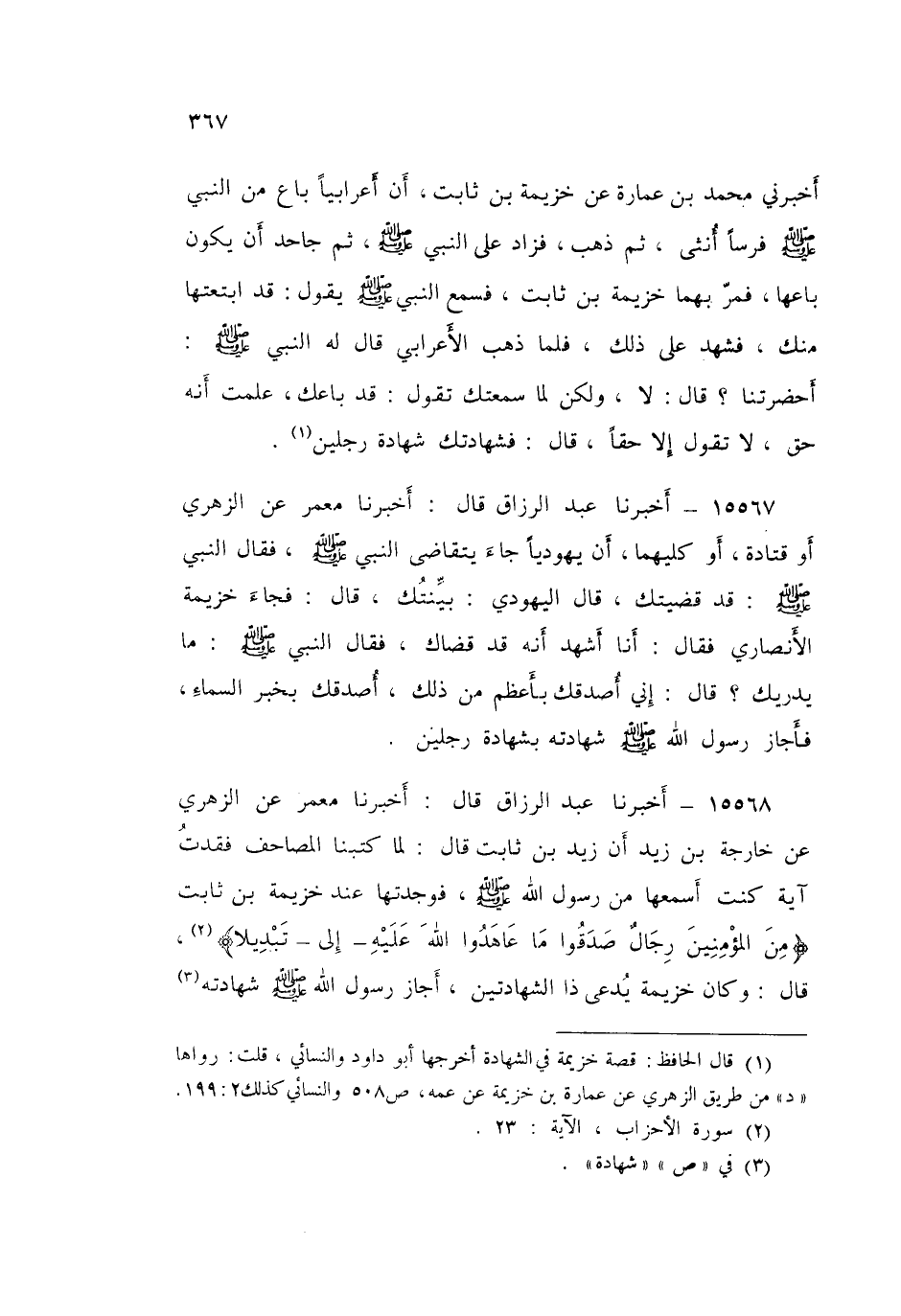 15568 - عَبْدُ الرَّزَّاقِ قَالَ: أَخْبَرَنَا مَعْمَرٌ، عَنِ الزُّهْرِيِّ، عَنْ خَارِجَةَ بْنِ زَيْدٍ، أَنَّ زَيْدَ بْنَ ثَابِتٍ قَالَ: لَمَّا كَتَبْنَا الْمَصَاحِفَ فَقَدْتُ آيَةً كُنْتُ أَسْمَعُهَا مِنْ رَسُولِ اللَّهِ صَلَّى اللهُ عَلَيْهِ وَسَلَّمَ، فَوَجَدْتُهَا عِنْدَ خُزَيْمَةَ بْنِ ثَابِتٍ: {مِنَ الْمُؤْمِنِينَ رِجَالٌ صَدَقُوا مَا عَاهَدُوا اللَّهَ عَلَيْهِ} [الأحزاب: 23] إِلَى {تَبْدِيلًا} [الأحزاب: 23] قَالَ: وَكَانَ خُزَيْمَةُ يُدْعَى: ذَا الشَّهَادَتَيْنِ، «§أَجَازَ رَسُولُ اللَّهِ صَلَّى اللهُ عَلَيْهِ وَسَلَّمَ، شَهَادَتَهُ بِشَهَادَتَيْنِ»، قَالَ الزُّهْرِيُّ: «وَقُتِلَ يَوْمَ صِفِّينَ»