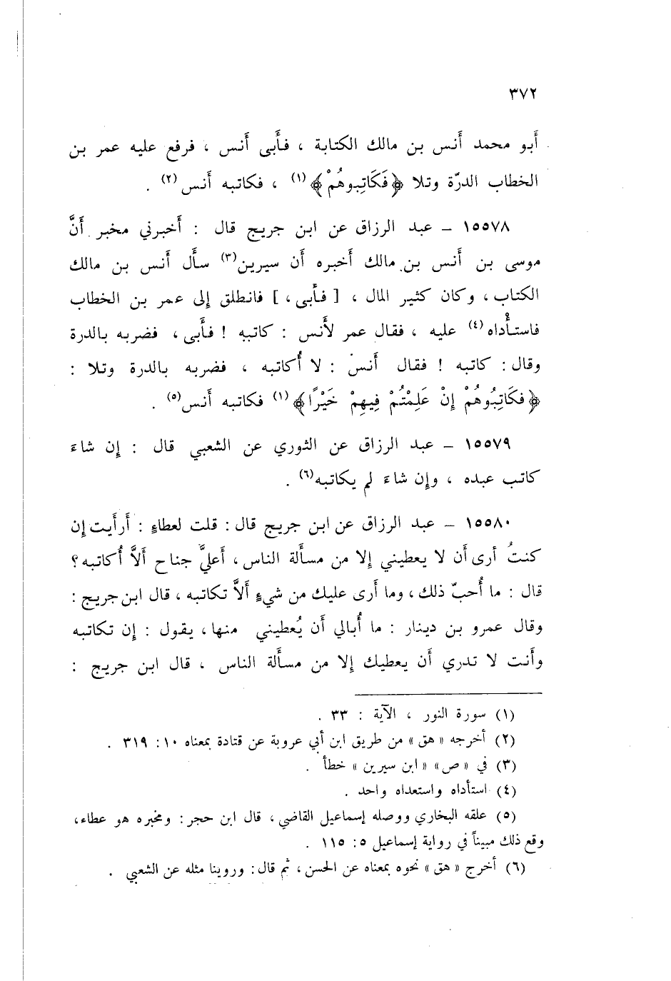 15580 - عَنِ ابْنِ جُرَيْجٍ قَالَ: قُلْتُ لِعَطَاءٍ: أَرَأَيْتَ إِنْ كُنْتُ أَرَى أَنْ §لَا يُعْطِيَنِي إِلَّا مِنْ مَسْأَلَةِ النَّاسِ أَعَلَيَّ جُنَاحٌ أَلَا أُكَاتِبَهُ؟ قَالَ: «مَا أَحَبُّ ذَلِكَ، وَمَا أَرَى عَلَيْكَ مِنْ شَيْءٍ أَلَّا تُكَاتِبَهُ»، قَالَ ابْنُ جُرَيْجٍ: وَقَالَ عَمْرُو بْنُ دِينَارٍ: «مَا أُبَالِي أَنْ يُعْطِيَنِي مِنْهَا» يَقُولُ: «إِنْ تُكَاتِبْهُ وَأَنْتَ لَا تَدْرِي أَنْ يُعْطِيكَ إِلَّا مِنْ مَسْأَلَةِ النَّاسِ»