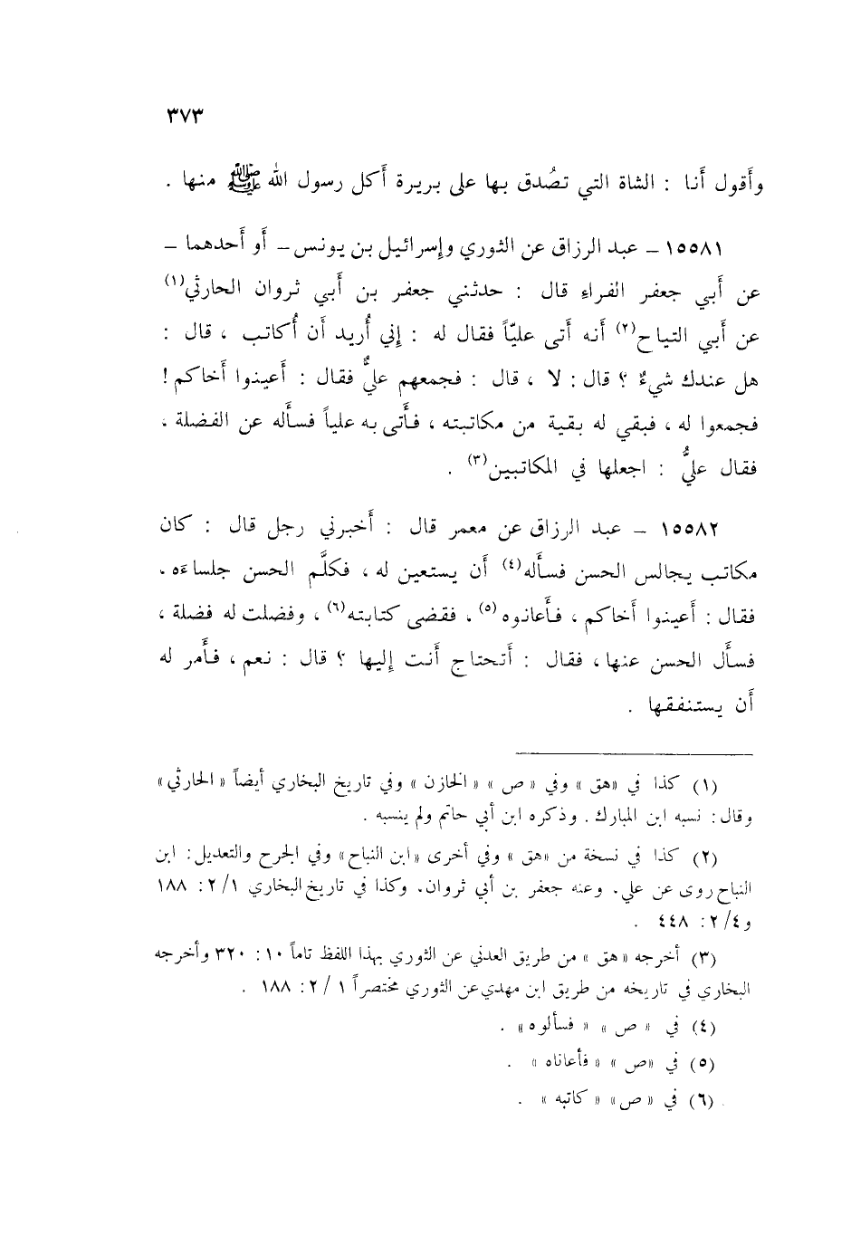 15582 - عَنْ مَعْمَرٍ قَالَ: أَخْبَرَنِي رَجُلٌ قَالَ: كَانَ مُكَاتَبٌ يُجَالِسُ الْحَسَنَ فَسَأَلَهُ أَنْ يَسْتَعِينَ لَهُ، فَكَلَّمَ الْحَسَنُ جُلَسَاءَهُ، فَقَالَ: «§أَعِينُوا أَخَاكُمْ»، فَأَعَانُوهُ، فَقَضَى كِتَابَتَهُ، وَفَضَلَتْ لَهُ فَضْلَةً، فَسَأَلَ الْحَسَنَ عَنْهَا، فَقَالَ: «أَتَحْتَاجُ أَنْتَ إِلَيْهَا؟» قَالَ: نَعَمْ، فَأَمَرَ لَهُ أَنْ يَسْتَنْفِقَهَا