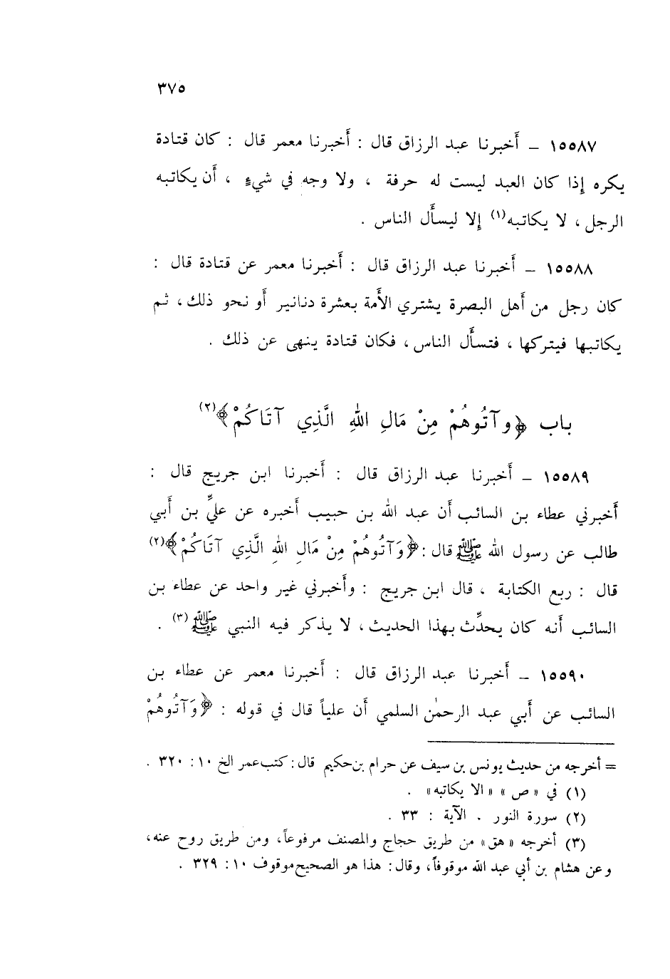15589 - عَبْدُ الرَّزَّاقِ قَالَ: أَخْبَرَنَا ابْنُ جُرَيْجٍ قَالَ: أَخْبَرَنِي عَطَاءُ بْنُ السَّائِبِ، أَنَّ عَبْدَ اللَّهِ بْنَ حَبِيبٍ أَخْبَرَهُ، عَنْ عَلِيِّ بْنِ أَبِي طَالِبٍ، عَنْ رَسُولِ اللَّهِ صَلَّى اللهُ عَلَيْهِ وَسَلَّمَ قَالَ: {§وَآتُوهُمْ مِنْ مَالِ اللَّهِ الَّذِي آتَاكُمْ} [النور: 33] قَالَ: «رُبْعُ الْكِتَابَةِ»، قَالَ ابْنُ جُرَيْجٍ: وَأَخْبَرَنِي غَيْرُ وَاحِدٍ، عَنْ عَطَاءِ بْنِ السَّائِبِ أَنَّهُ كَانَ يُحَدِّثُ بِهَذَا الْحَدِيثِ لَا يَذْكُرُ فِيهِ النَّبِيَّ صَلَّى اللهُ عَلَيْهِ وَسَلَّمَ