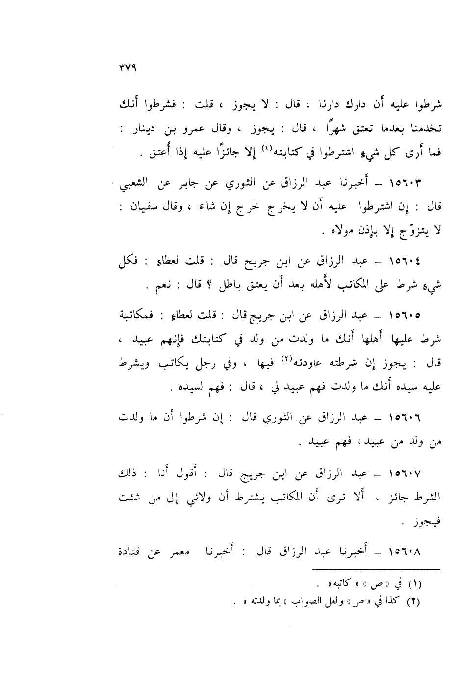 15607 - عَنِ ابْنِ جُرَيْجٍ قَالَ: أَقُولُ أَنَا: «ذَلِكَ الشَّرْطُ جَائِزٌ، أَلَا تَرَى أَنَّ §الْمُكَاتَبَ يَشْتَرِطُ أَنَّ وَلَائِي إِلَى مِنْ شِئْتُ فَيَجُوزُ»